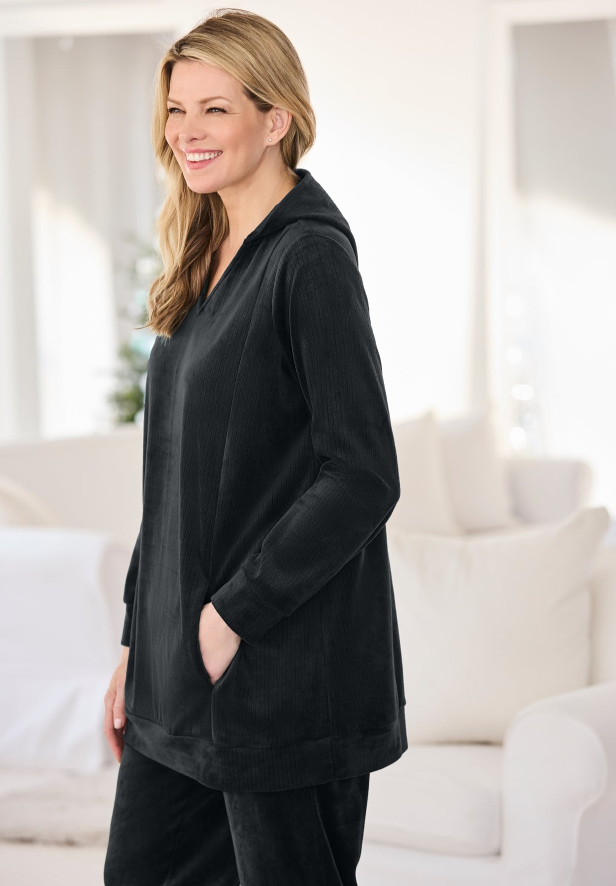 Designed with an easy Y-neckline and plush ribbed texture, this long-sleeve sweatshirt brings elevated comfort to your everyday. Side pockets keep your essentials close, while the soft velour fabric keeps you warm all season long. Perfect for lounging, gifting, or pairing with our matching velour bottoms for a festive head-to-toe look.