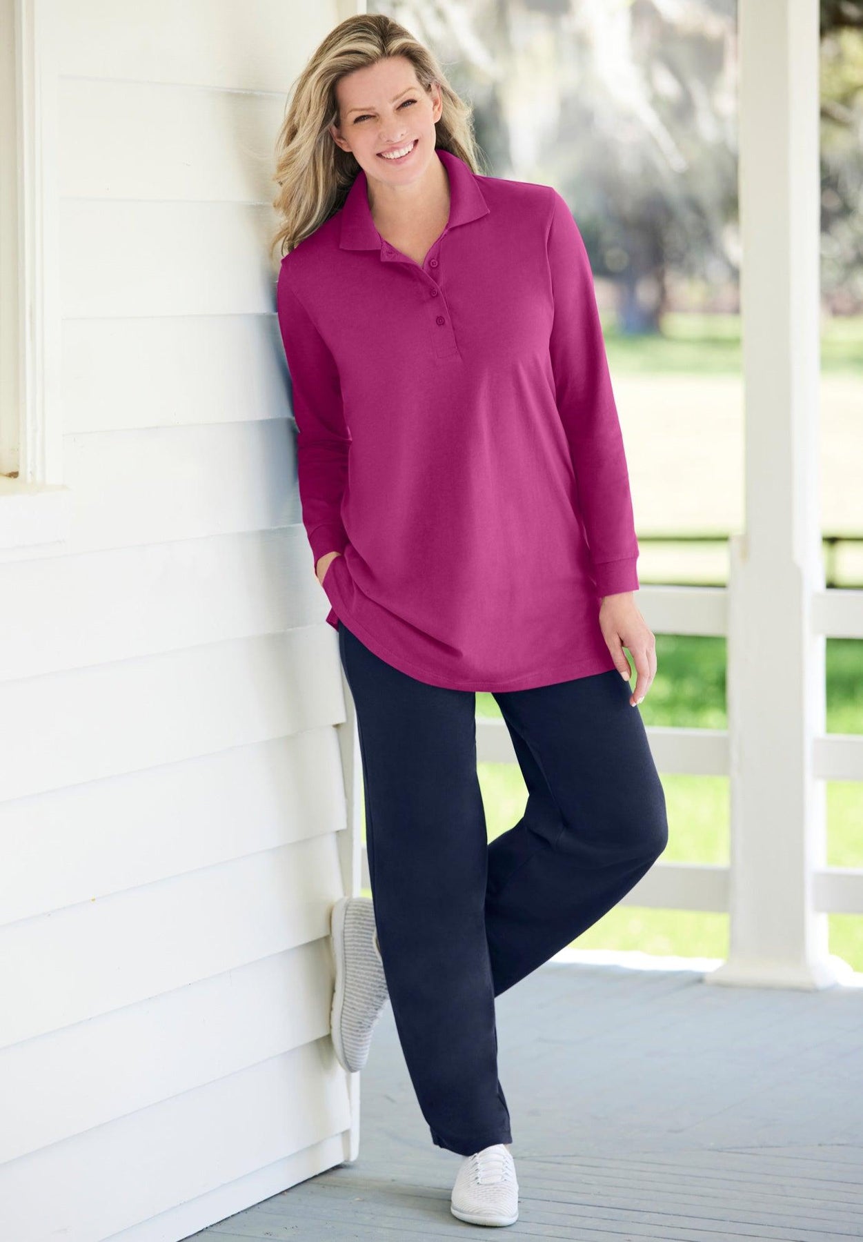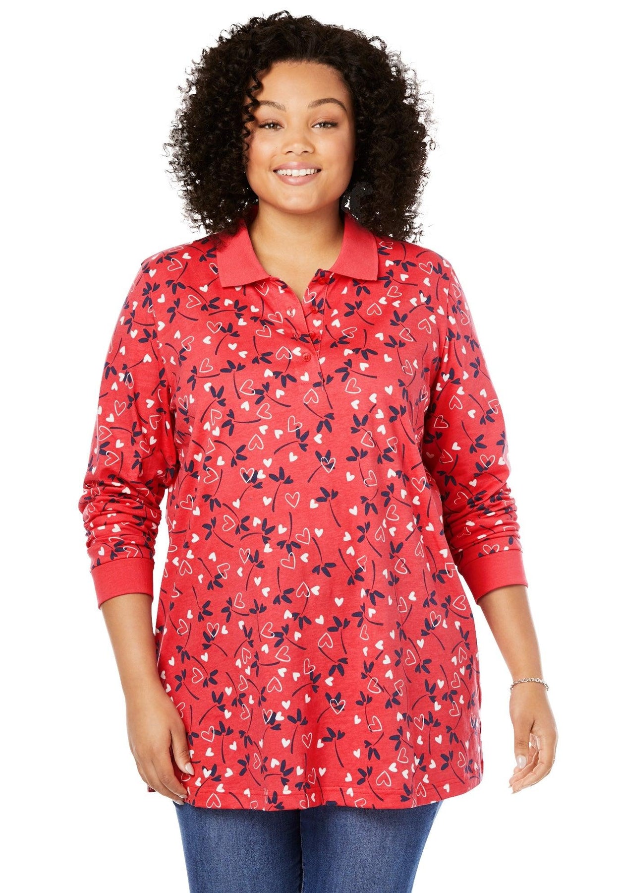 This roomy polo knit is a cute choice for relaxed comfort and breathable ease. Ribbed cuffs allow you to push the sleeves up for a casual look, or wear them down, and a four-button placket with collar stays in line with the classic polo look. Made in our most-loved tunic length.