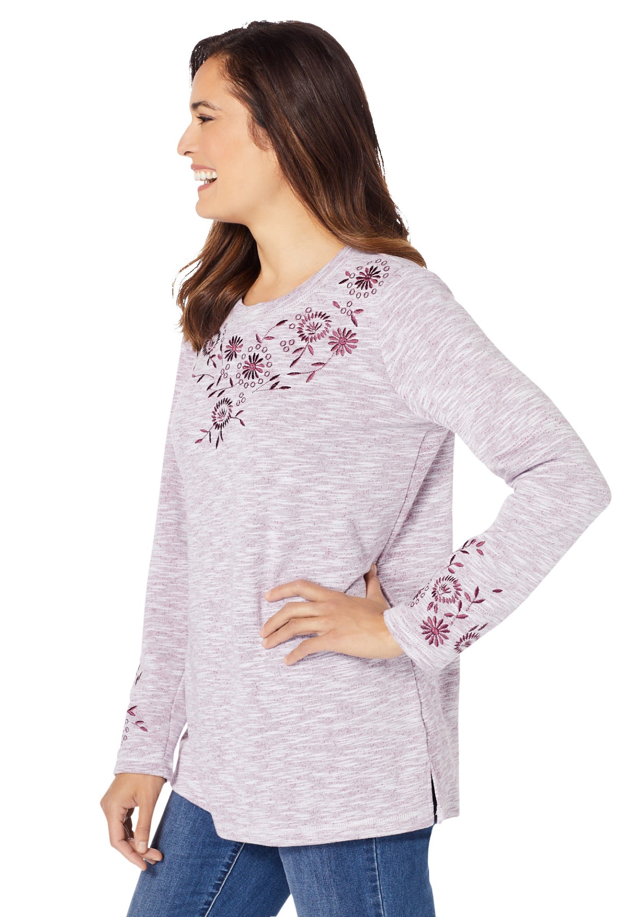 Our sweatshirt tee is the best of both worlds. It's made from soft French terry and features pretty embroidery around the neckline and sleeves.