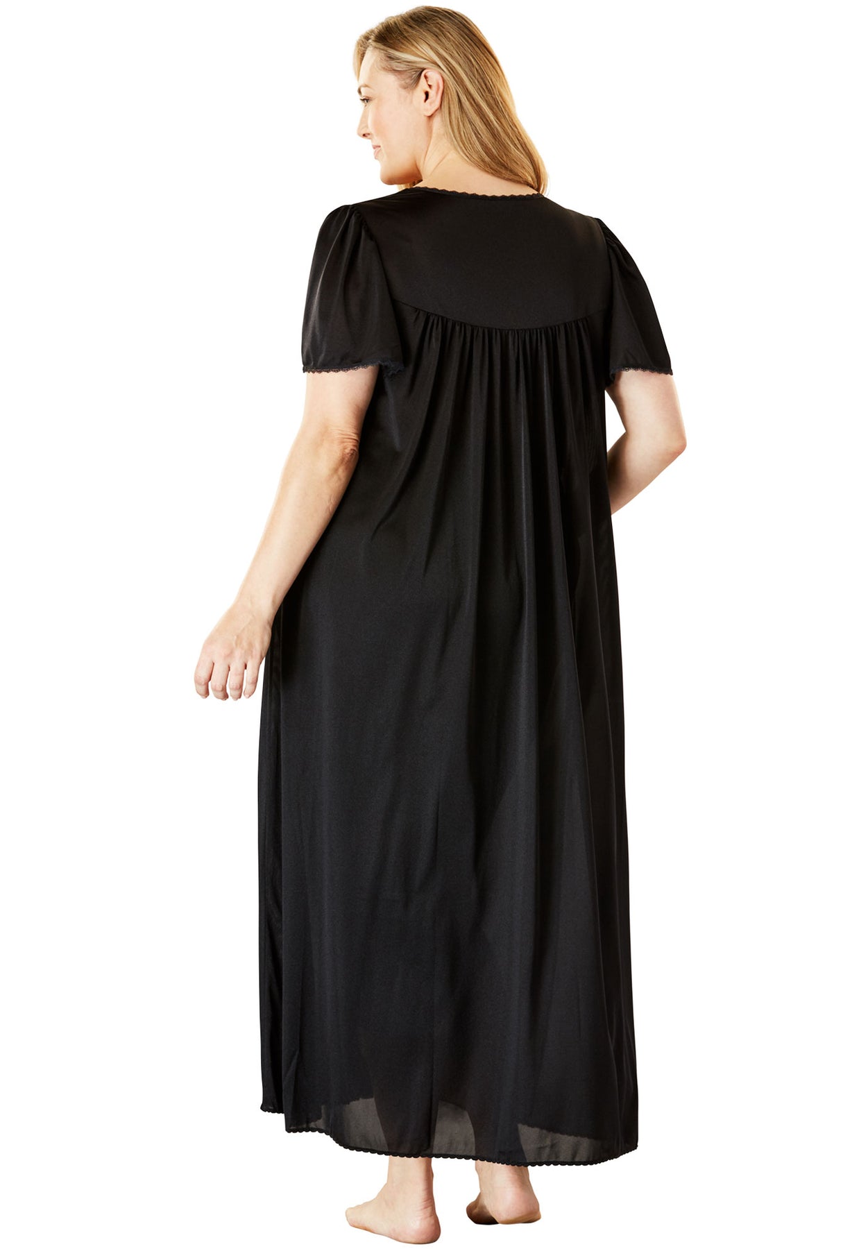 Enjoy blissful sleep in this sweeping, silky nightgown that's smooth and cling-free. A sweetheart neckline with scalloped lace, rosettes and a bow adds delightful and feminine detail to this flutter-sleeve sleepwear that is sure to give you sweet dreams. Perfect for relaxing or sleeping.