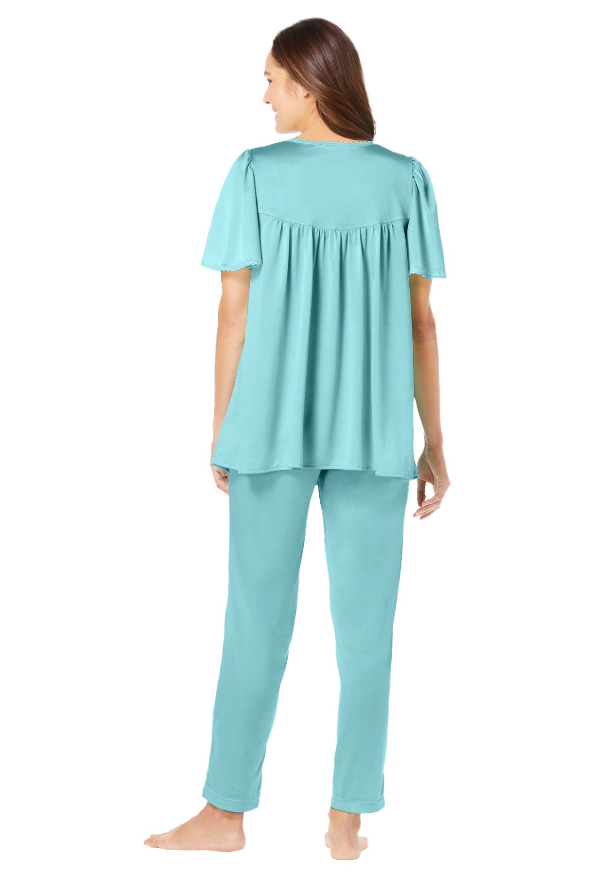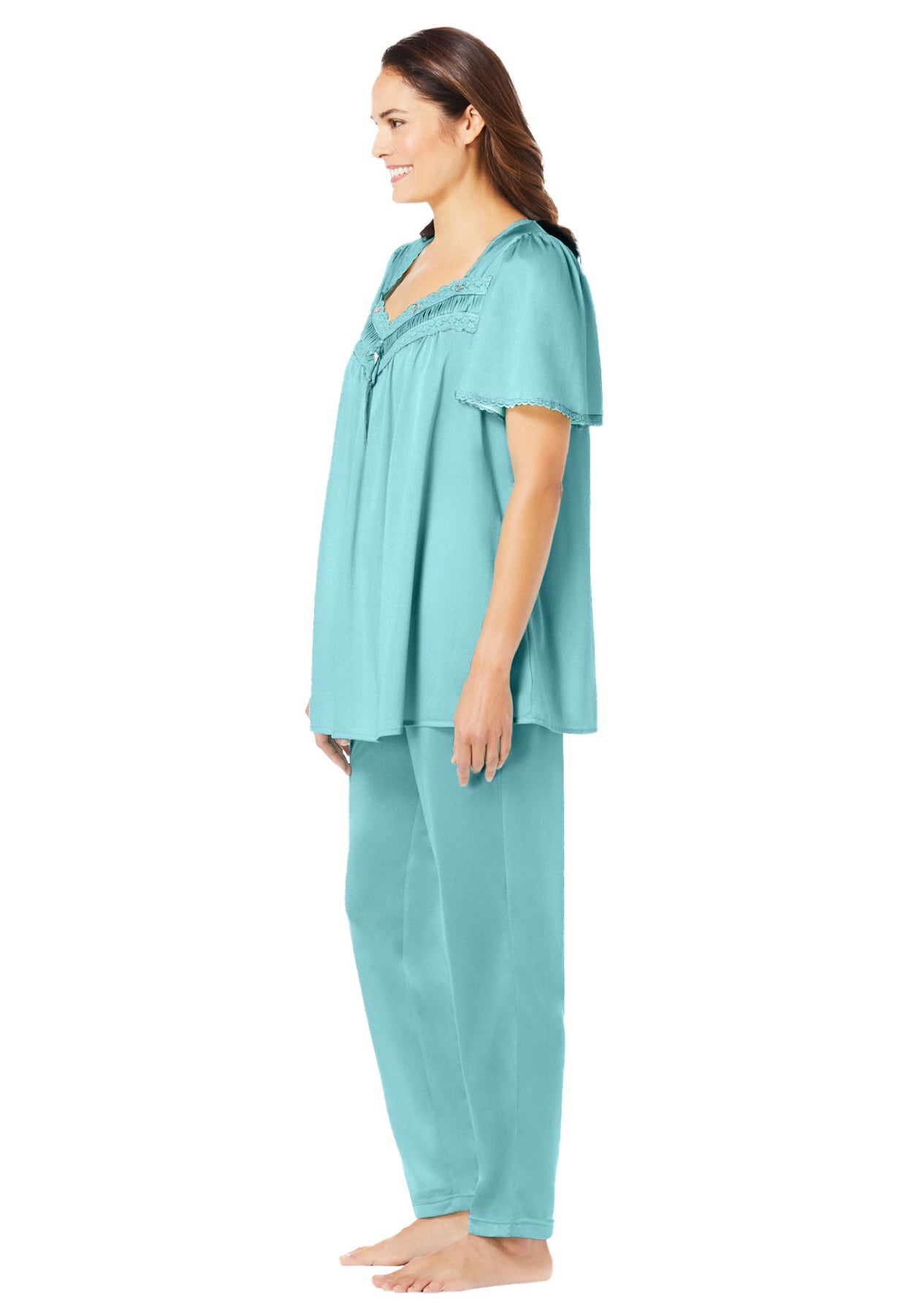 Sweet and feminine, this pajama set features a pretty flutter sleeve top with delicate shirring above the bust and tiny rosette accents for lovely detail. Paired with matching elastic-waist pants, this gorgeous set is supremely silky and feels amazing when lounging or sleeping.