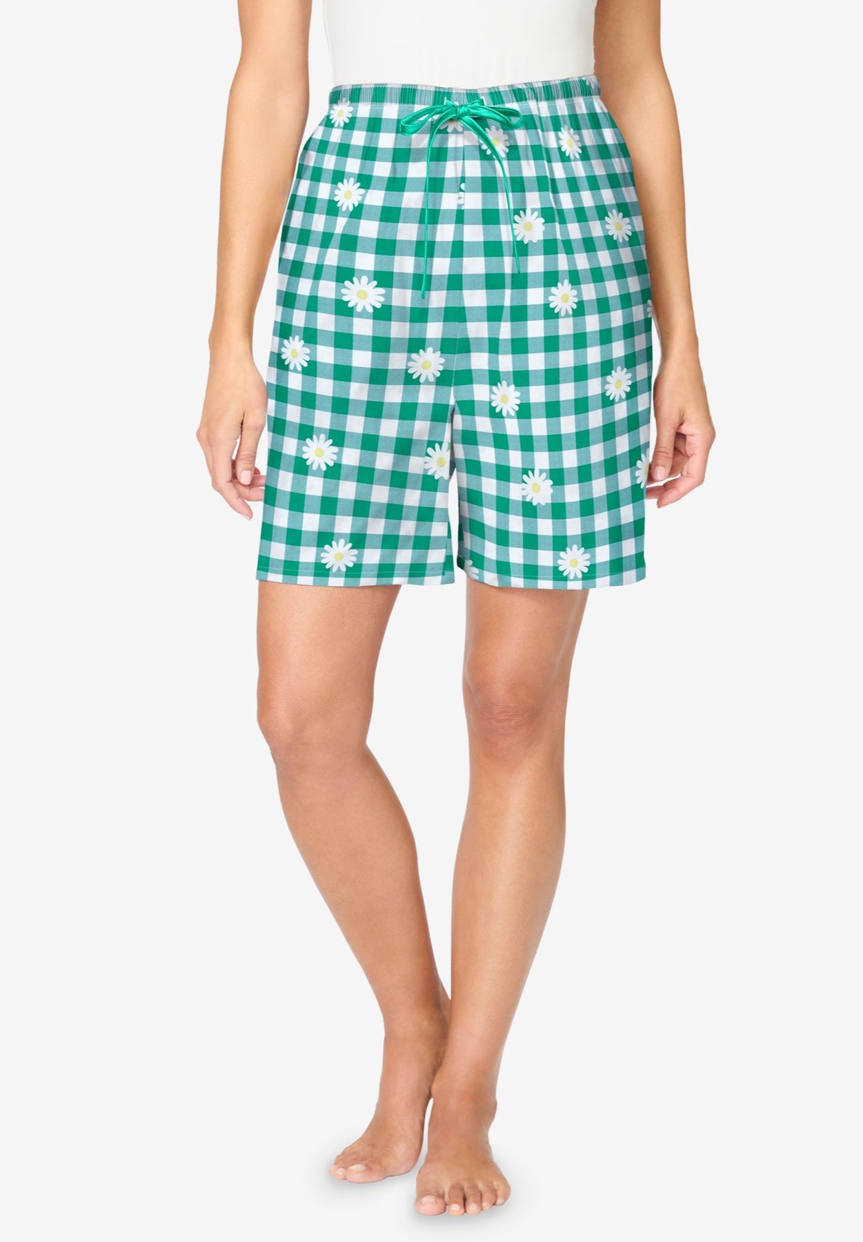 These woven cotton pajama shorts come with a wide, cropped leg for ultimate comfort. An elastic waist provides a perfect fit every time without pinching. Comes with a pretty satin tie at waist and straight bottom hem with 5" inseam.