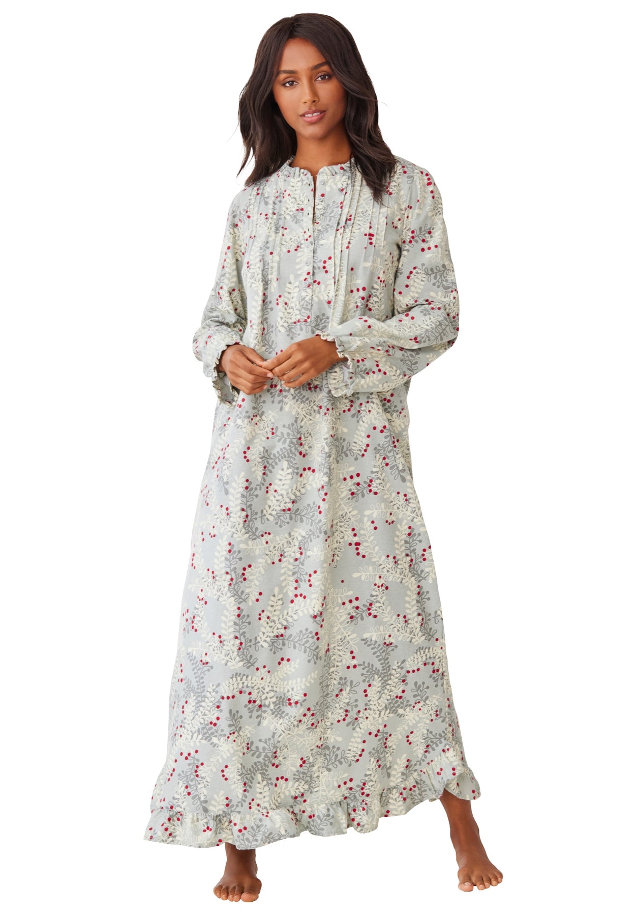 Love this warm winter nightgown It is long and full with a ruffle in the bottom The sleeves have ruffles at the wrist too The print is cute the colors are great and it feels just like a winter nightgown should It did fade some but I am okay with that