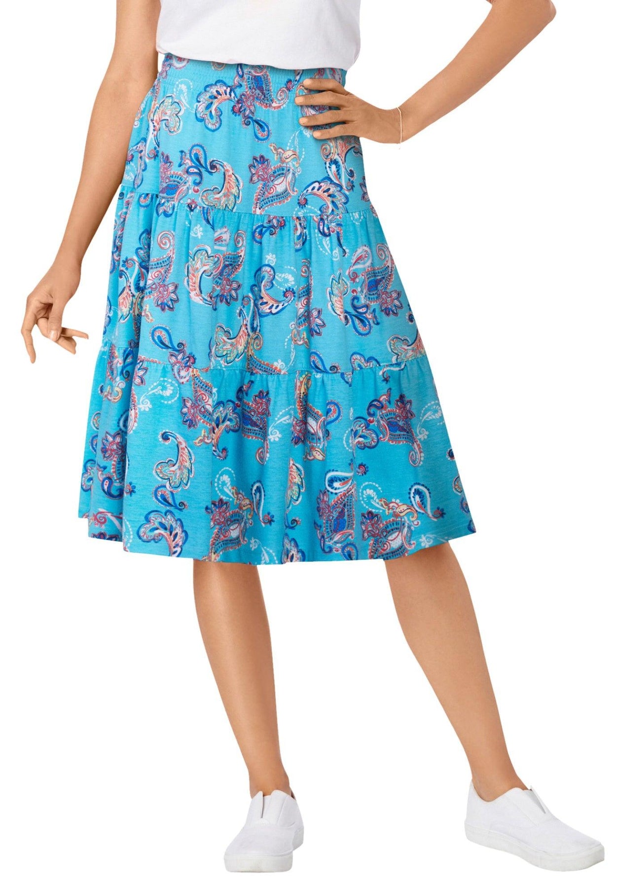 This tiered skirt is made in a jersey knit that's super easy and super comfortable. A full elastic pull-on waist offers all-day comfort and also creates a perfect fit.