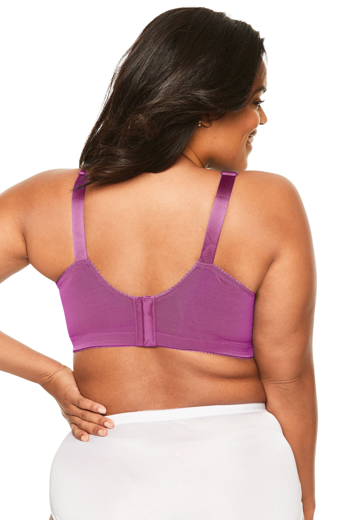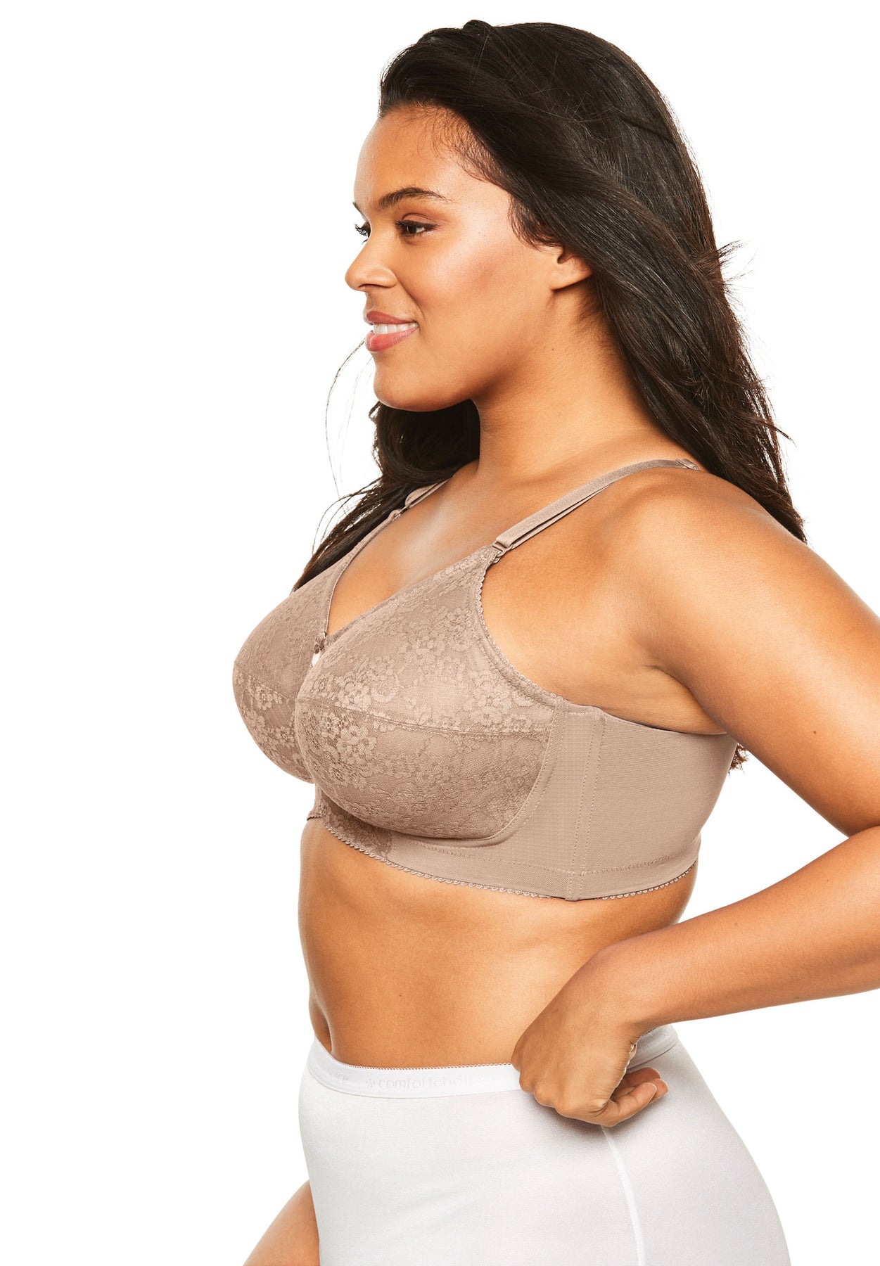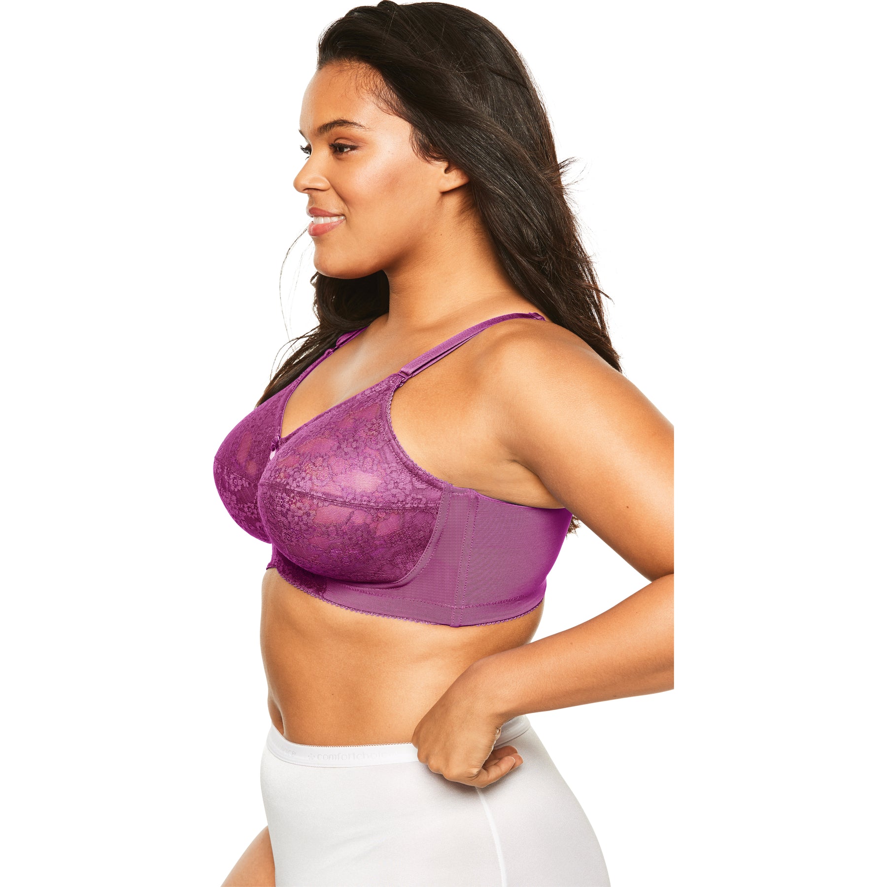 This full-coverage wireless lace bra has soft lace cups with seaming and an inner sling for shape and support. Designed with non-stretch woven straps and a contoured bottom band plus boning at the side seams for extra support.