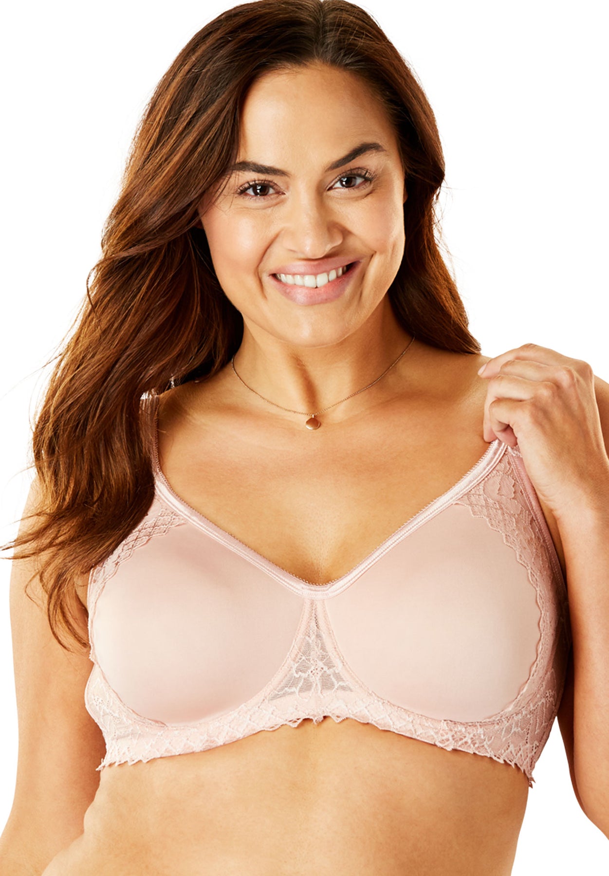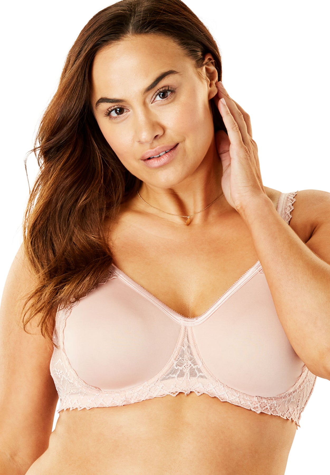 You'll love the look and feel of this lightly padded full-coverage t-shirt bra. Molded, breathable spacer cups and an underwire provide great support. Designed with G-hook to crisscross straps as needed. Lace trim provides a pretty accent detail. Power mesh lining adds stretch and breathability.