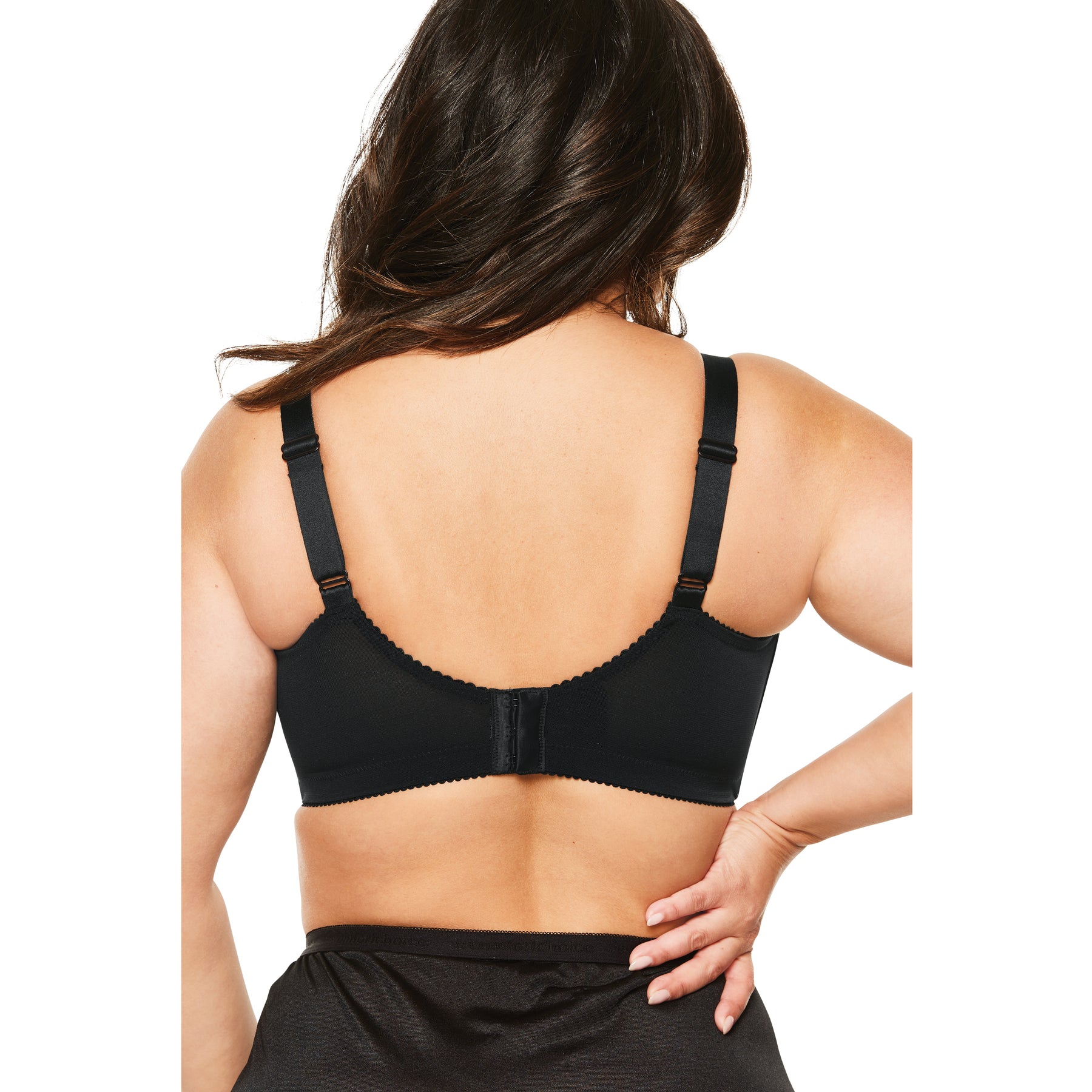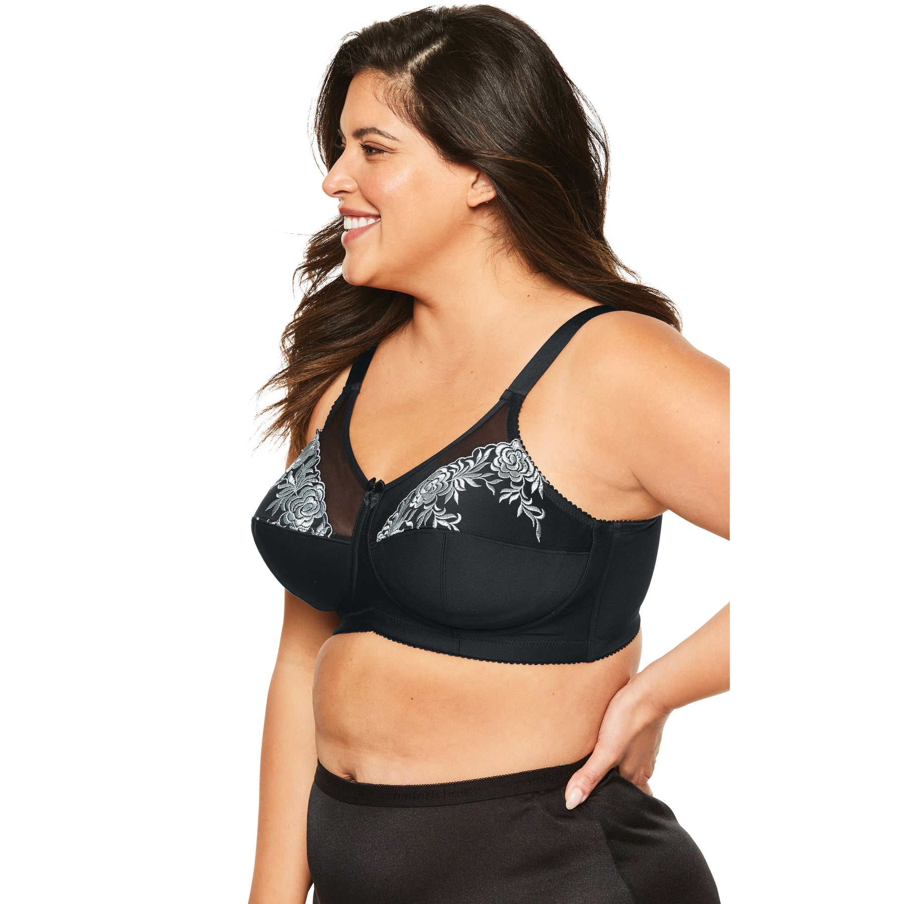 This wireless plus size bra is supportive, smooth and looks fabulous under all your tops. Three-piece cups with a cushioned sling help support the bust, and microfiber fabric on the cups and band add softness and comfort.