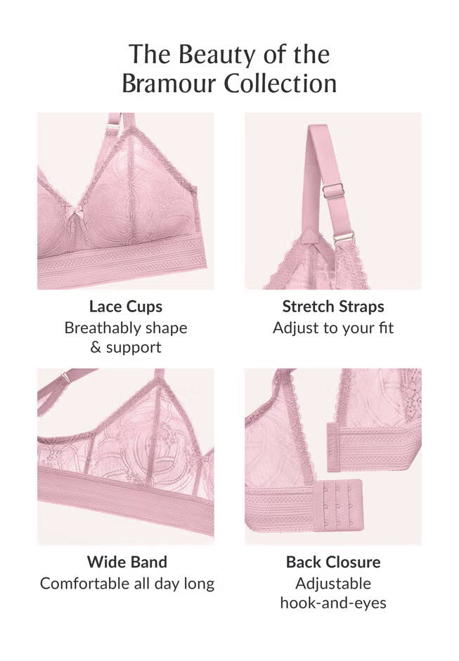 Plunge into comfort in this new lace bralette! Effortless low-cut neckline with smoothing lace that holds it shape. A wireless design that with 2-piece lace cups provide breathable shape and support. Adjustable non-slip stretch straps that form to your body. Wide, elastic band is comfortable all day long.