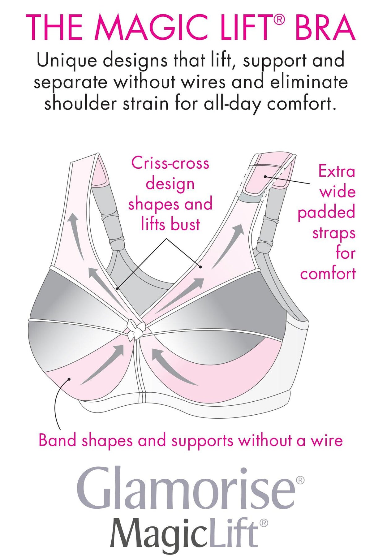 This full-coverage wireless bra features a Magic Lift® band that that crisscrosses around the cups to lift, shape and support without stiff wires. The extra-wide, adjustable straps feature light padding to prevent shoulder dig-in and comfortably stay up all day long. Beautiful embroidery and a petite bow accent the cups for a pretty touch.
