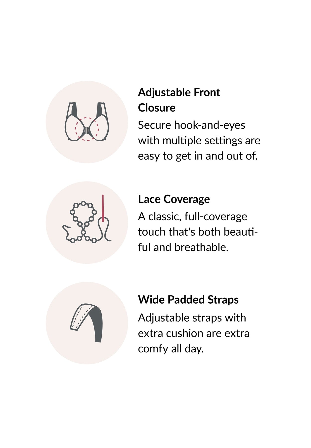 - Enjoy the convenience of a front closure, making putting on and taking off your bra a breeze.