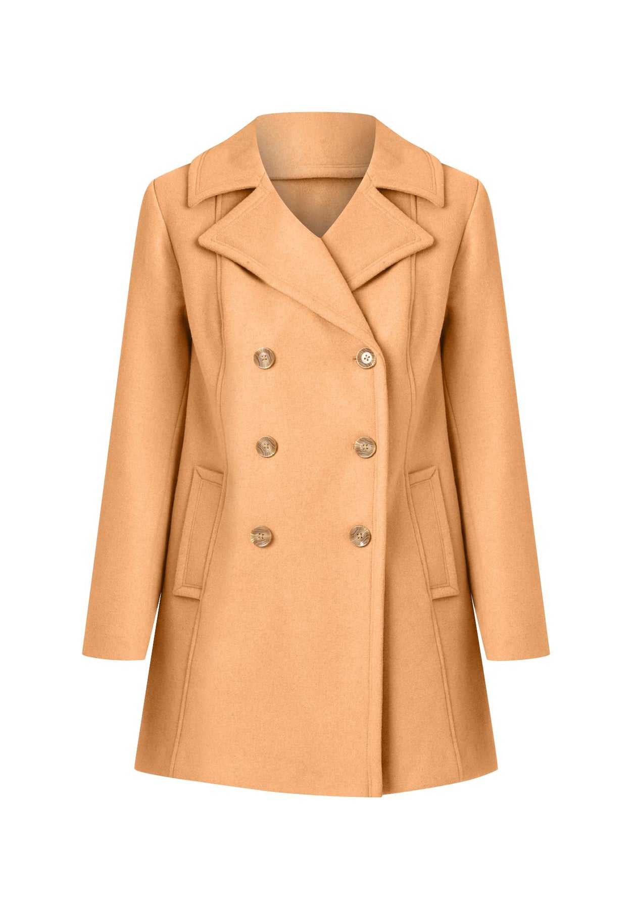 This beautiful peacoat will have you properly covered during cooler months. A notch collar with wide lapels frames the face, and a double-breasted button front provides an elegant closure. You’ll love the quilted lining and fleece-lined side pockets that will add an extra touch of warmth on chilly days. Front and back shaping seams create a feminine silhouette that allows this lovely piece to go with everything form casual jeans to dresses.