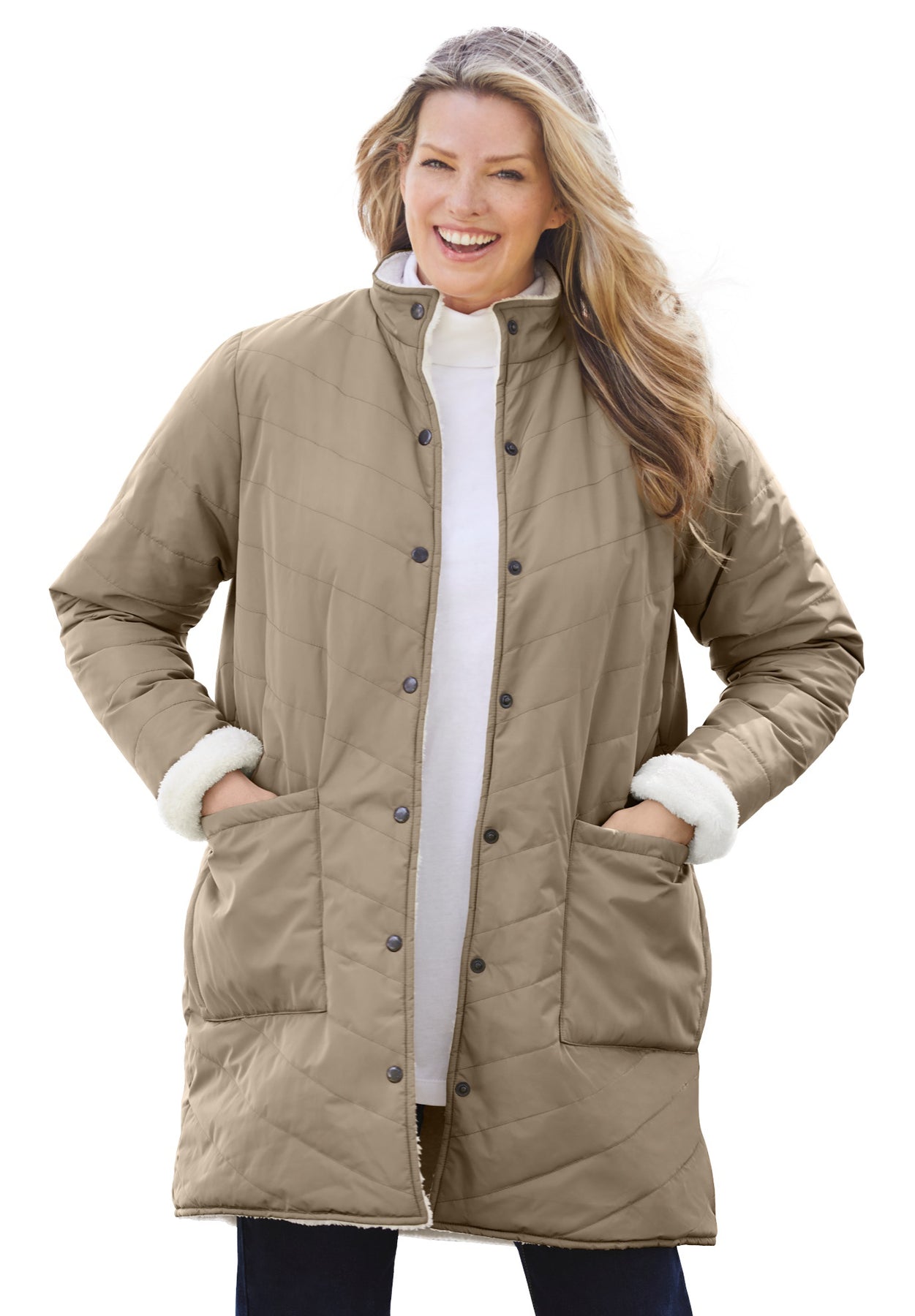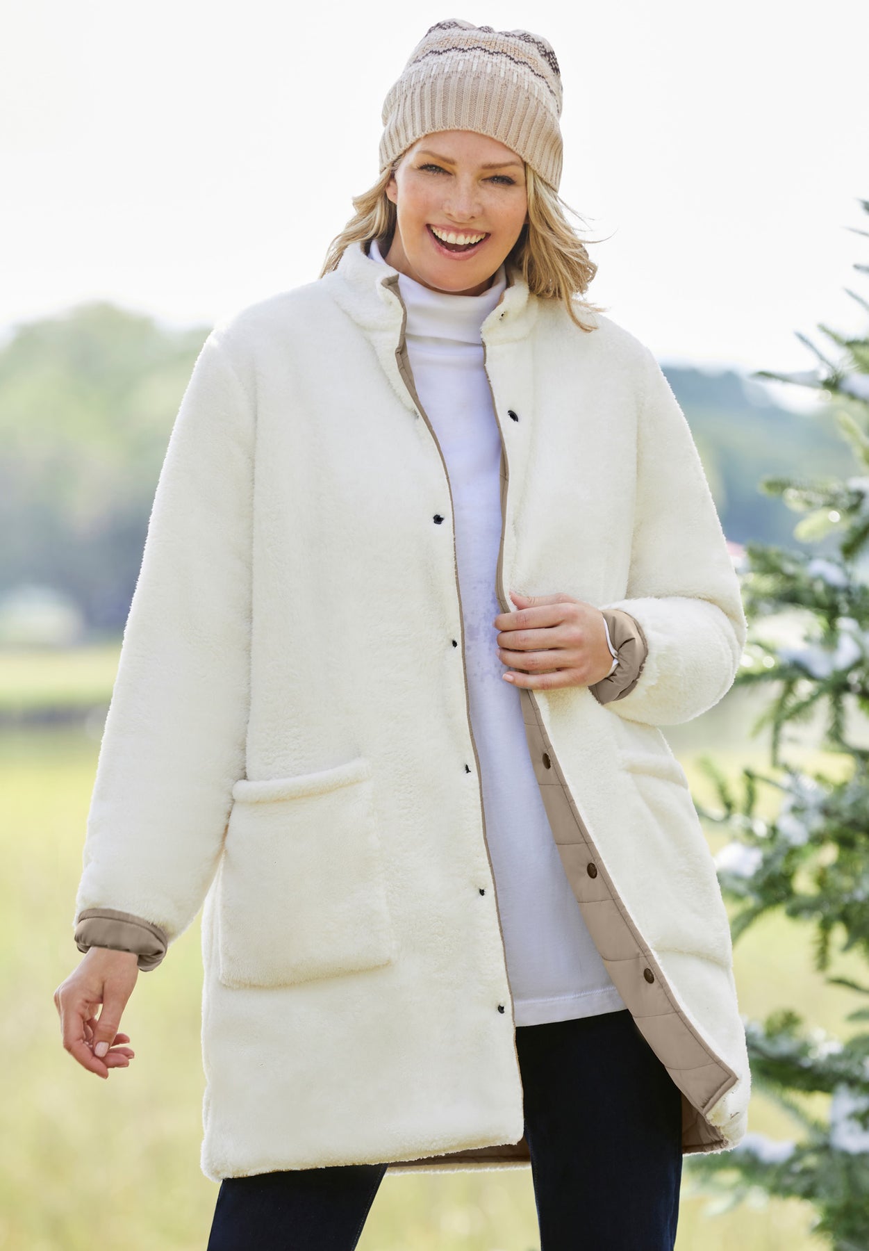 Reversible two-in-one coat for cold days and nights. Puffer outside with fluffy fleece inside to change as weather comes. Easy snap front closure with pockets to carry your go-to essentials. Stand collar.