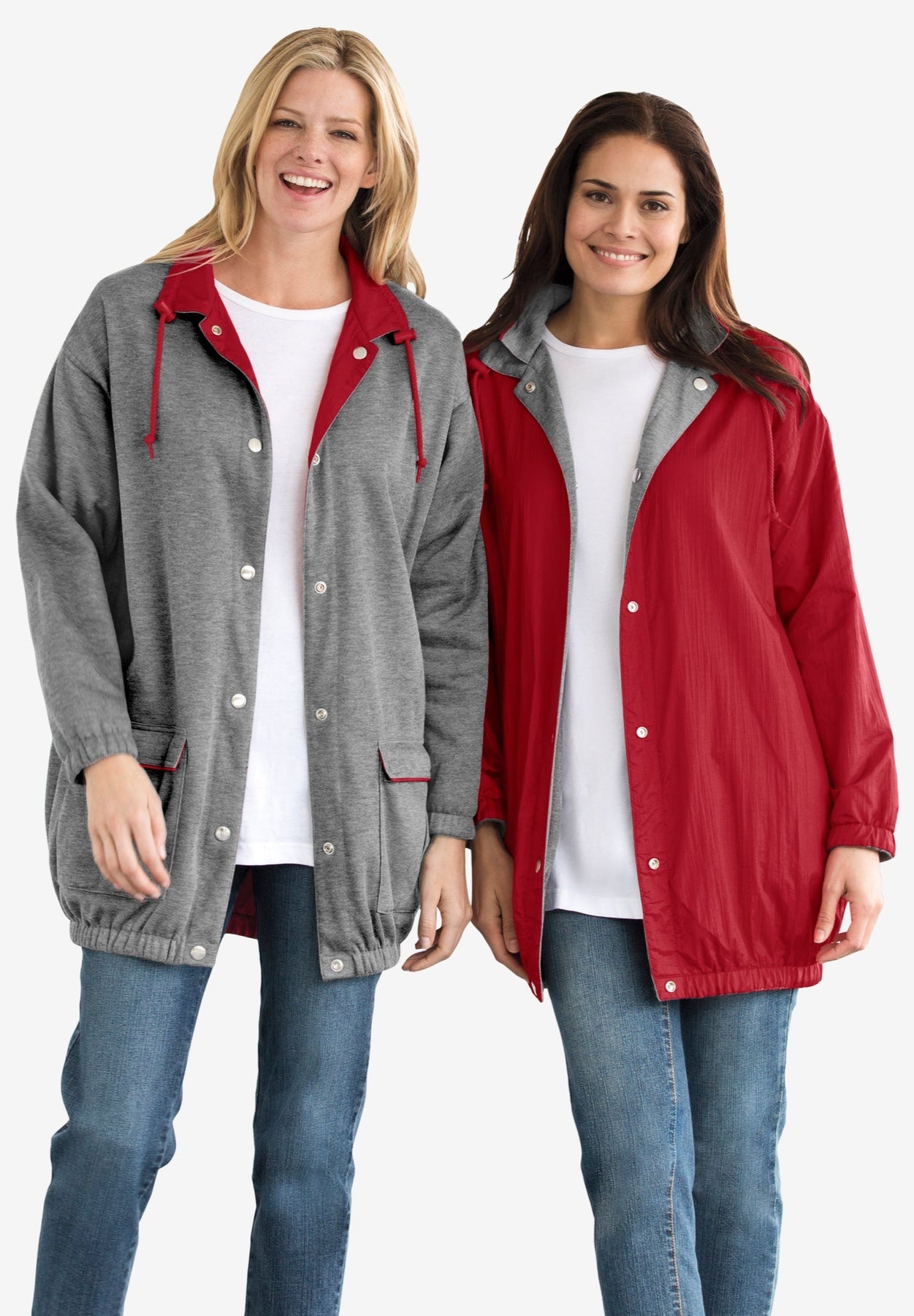 Just received my new rain fleece jacket yesterday and Im in love with it I ordered the biggest size 6x because I have a big protruding stomach and butt and obese Its very roomy everywhere on my body the snap buttons work fine Im especially pleased with the sleeves as they are the perfect length on me Im 5 foot and a half tall with very big arms The jacket hits my middle thighs No complains whatsoever I know it will last for a very long time because the fabric is of high quality too So comfortable and flattering I believe I have the weirdest shape ever for an obese woman and this jacket lives up to all of my expectations Thank you Woman Within for coming out with an exceptional outer garment
