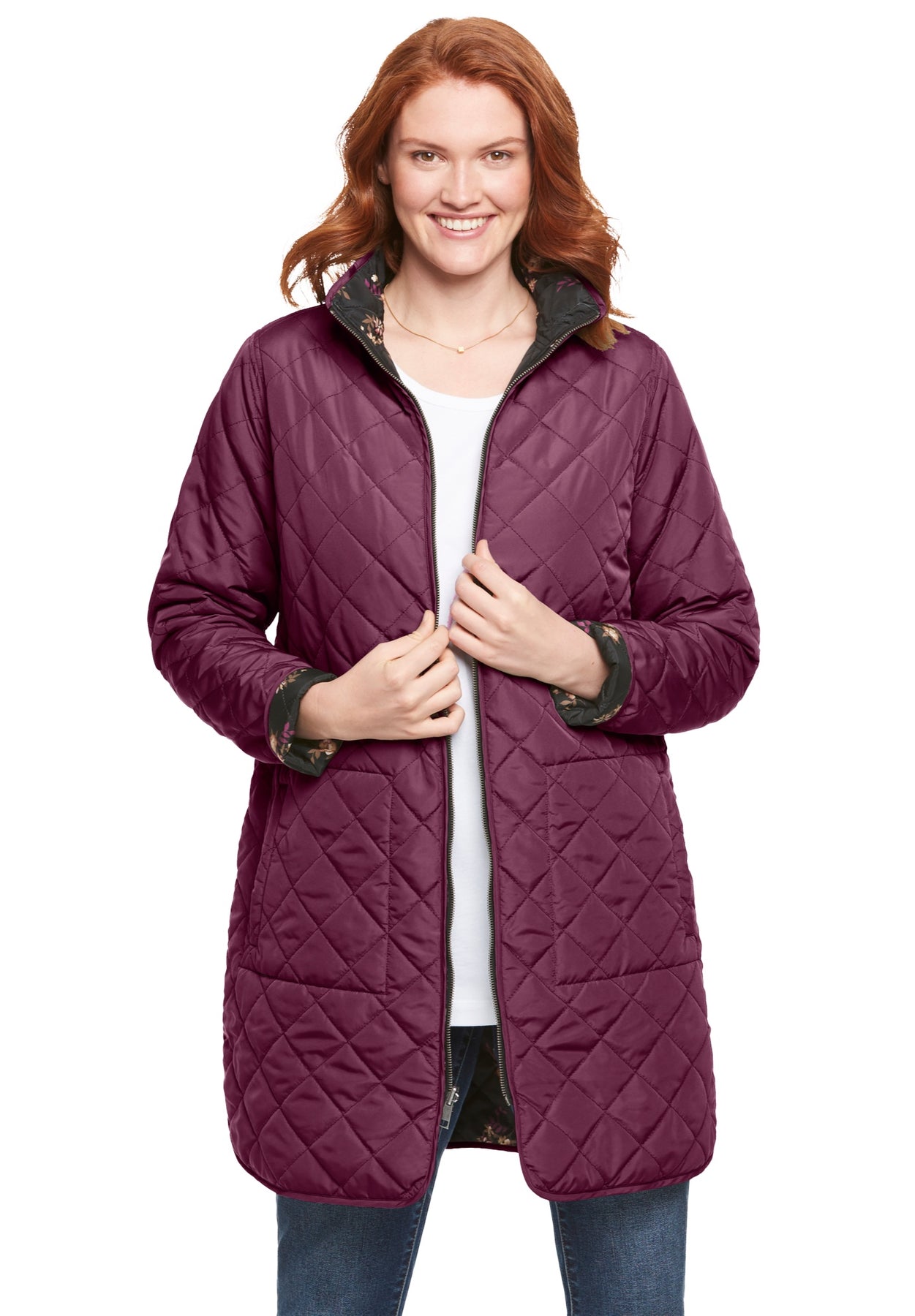 The jacket you can't live without! Two looks in one with reversible diamond quilt on both sides; solid color on one side, print on the other.