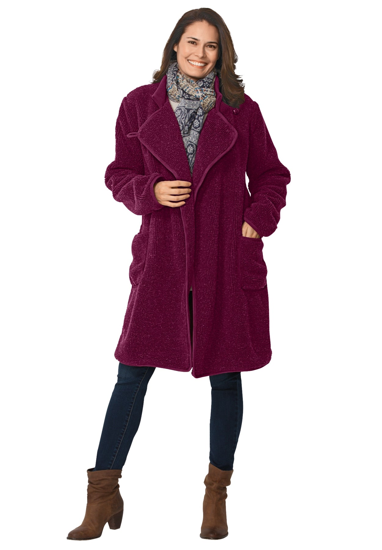 Mine is claret 4x In most things I buy 3 x size 3032 but in coats it seams I need 1 size up to get it wide enough that the shoulders arent too tight or the belly doesnt fit too snug around my hips and tummy I can get a 3x on usually but not comfortably I am glad I ordered the 4x in thisit gives me the oversized loose look you see on the model only plus sized of course Some might think it is too big buying a size up I guess it depends on your shape and the way you like your coats to fit I rated it a 4 instead of a 5 for one thing I didnt notice til I got it home There is only one button at the top nothing else to keep it closed and your warmth in So it is a great jacket for cool nights but not cold nights if that makes since unless you wear layers underneath