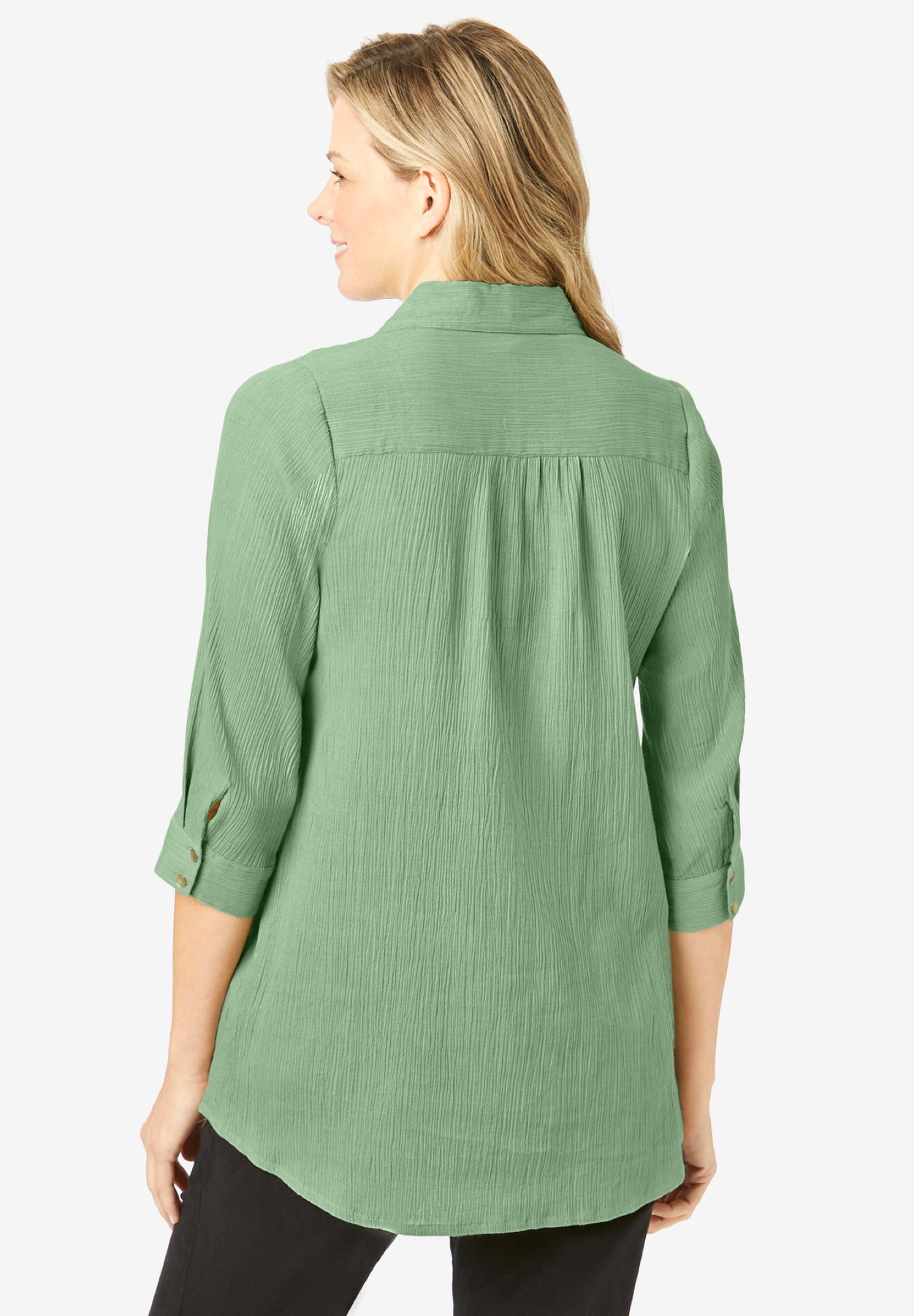 - Button-cuffed three-quarter sleeves