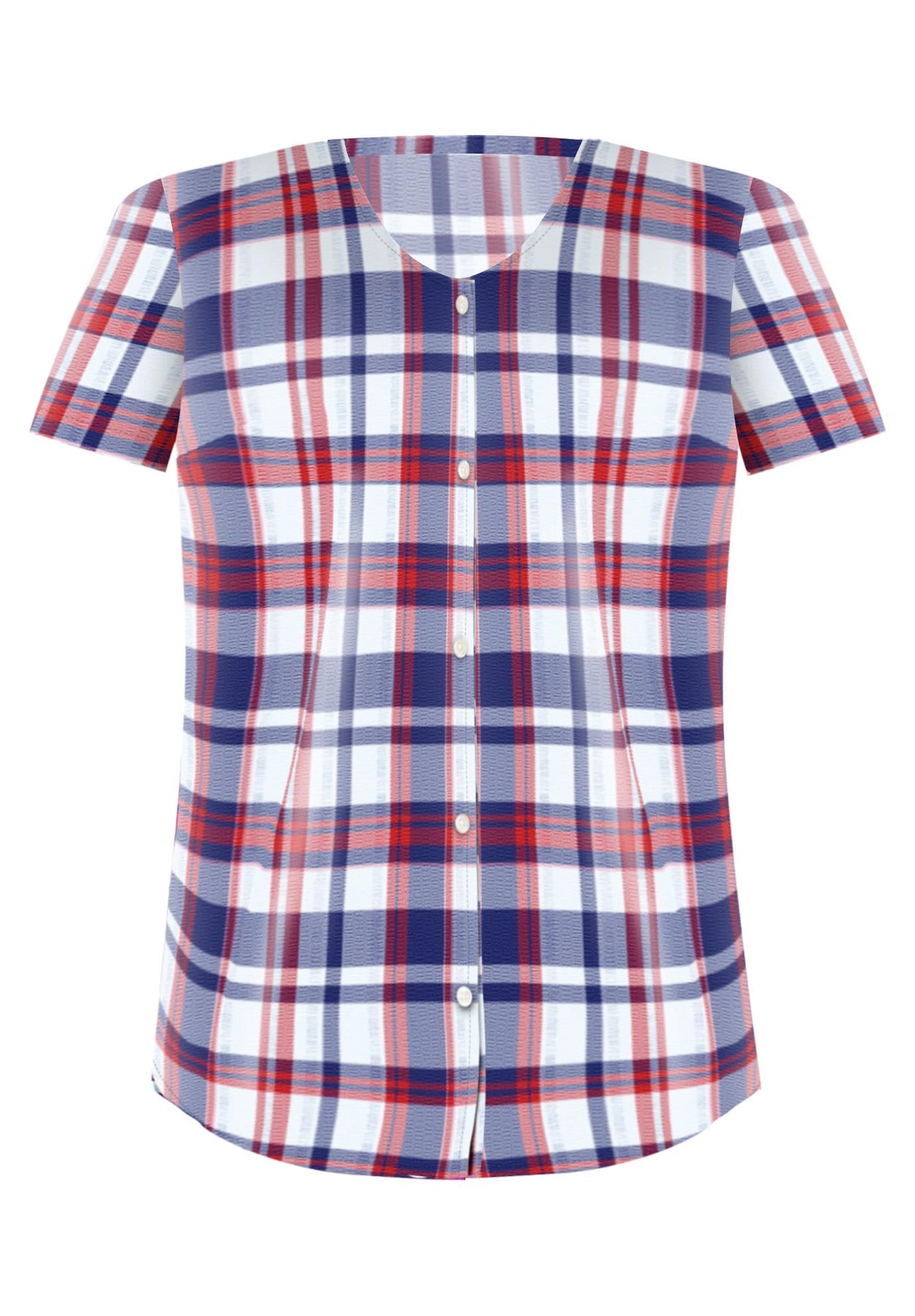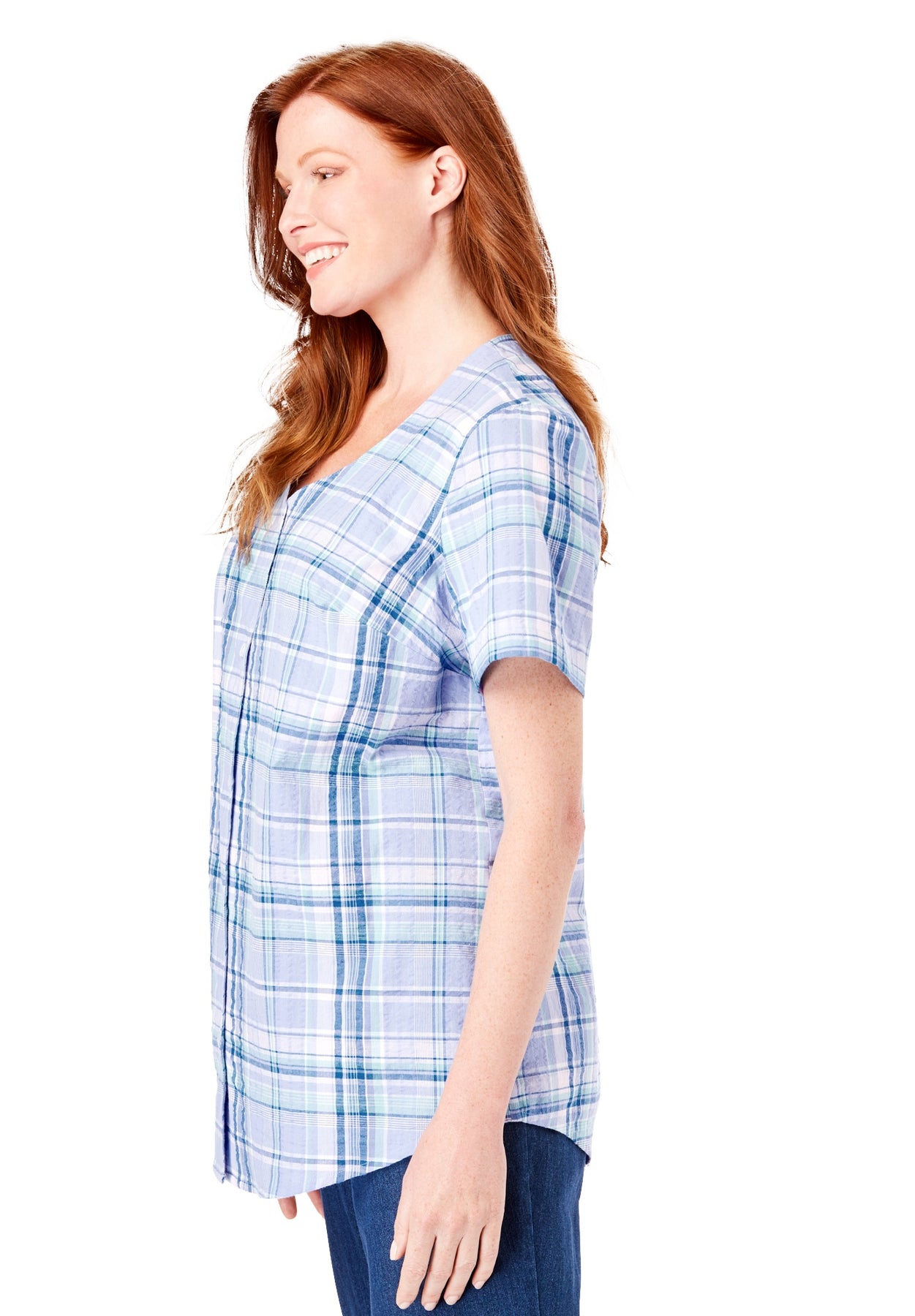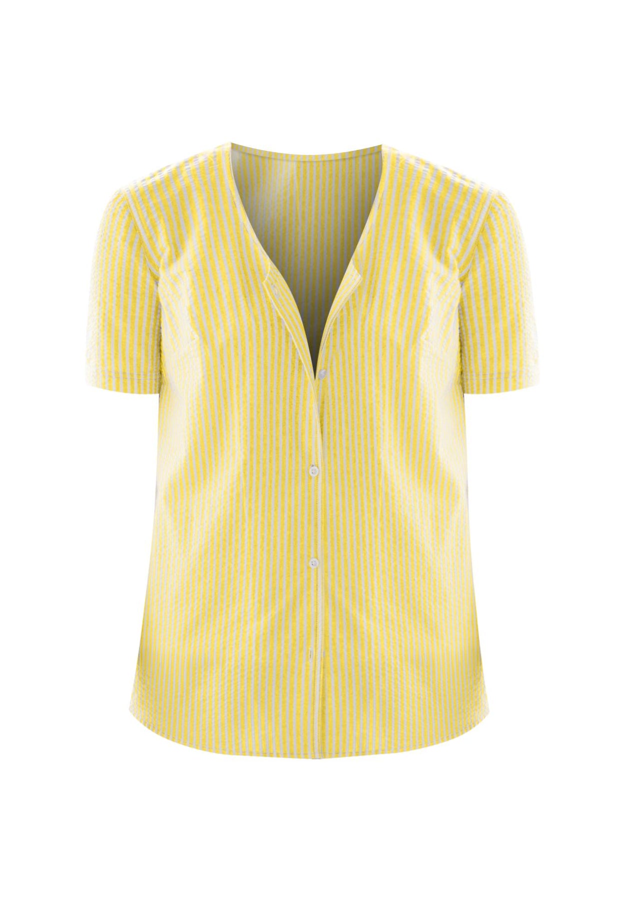 This lightweight seersucker button down comes in a cute V-neck shape. Made in a relaxed fit with short sleeves, its super comfortable and easy breezy. Perfect for warmer days when you want to look casual but put together.