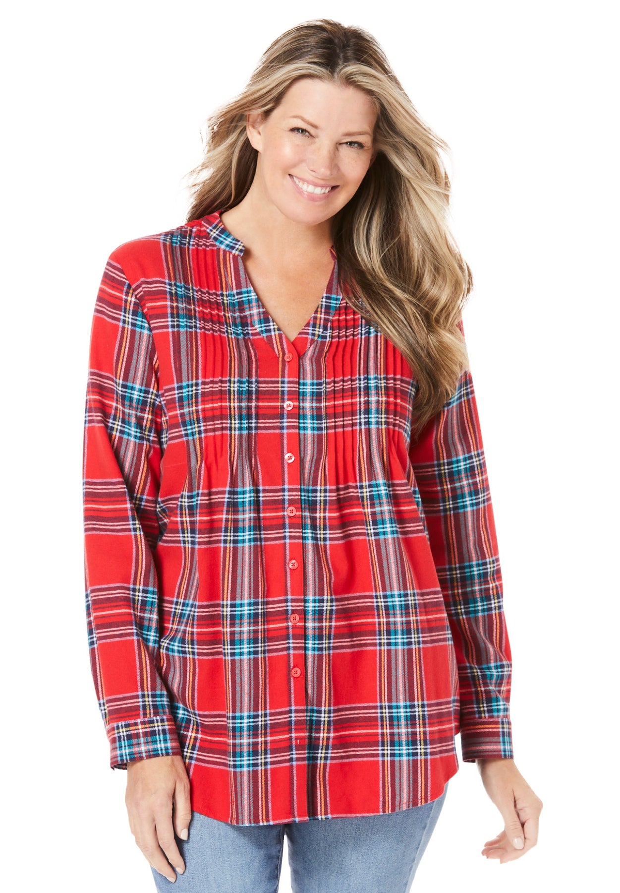 This super soft flannel has pretty pintucking along the front, making it more modern and feminine than your average plaid shirt. A Y-neckline and button front provide the option to wear it open as an over shirt, or closed as a blouse. Cozy up in pure cotton that feels amazing.