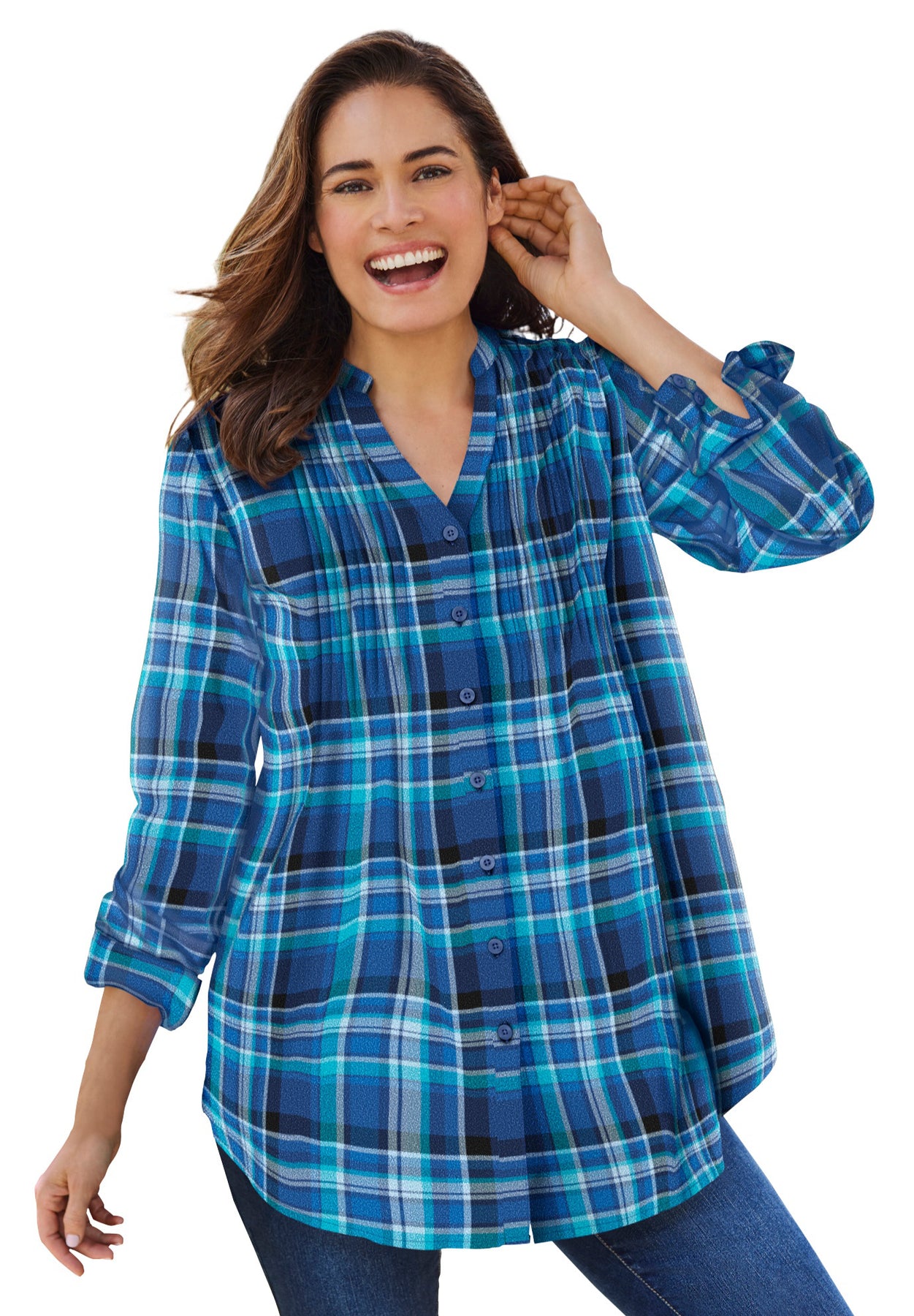 This super soft flannel has pretty pintucking along the front, making it more modern and feminine than your average plaid shirt. A Y-neckline and button front provide the option to wear it open as an over shirt, or closed as a blouse. Cozy up in pure cotton that feels amazing.
