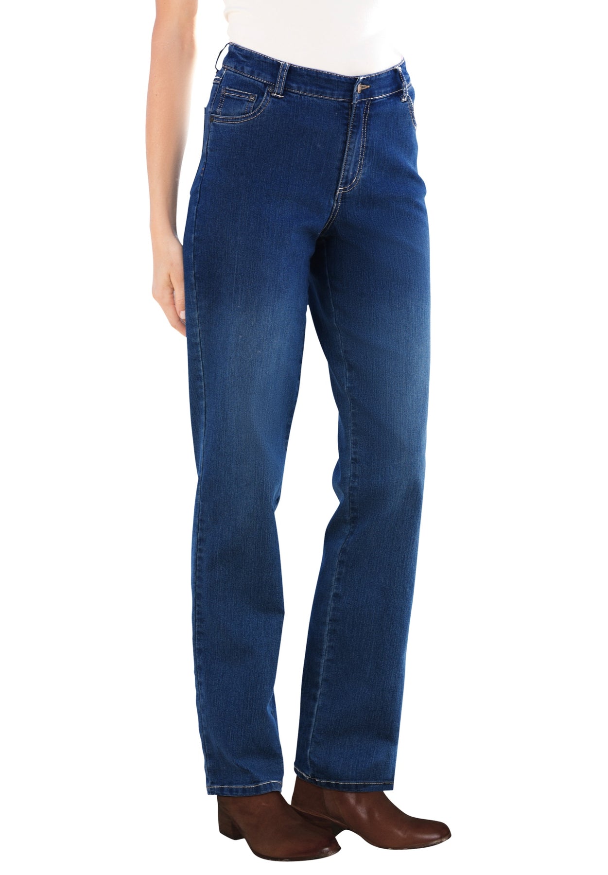 These classic five-pocket jeans are made from soft stretch cotton for a great fit that moves with your body. A straight-leg pairs with your favorite shoes effortlessly. Our special stretch blend hugs your curves comfortably, achieving a feminine shape. The zip fly front secures with a jean tack button.