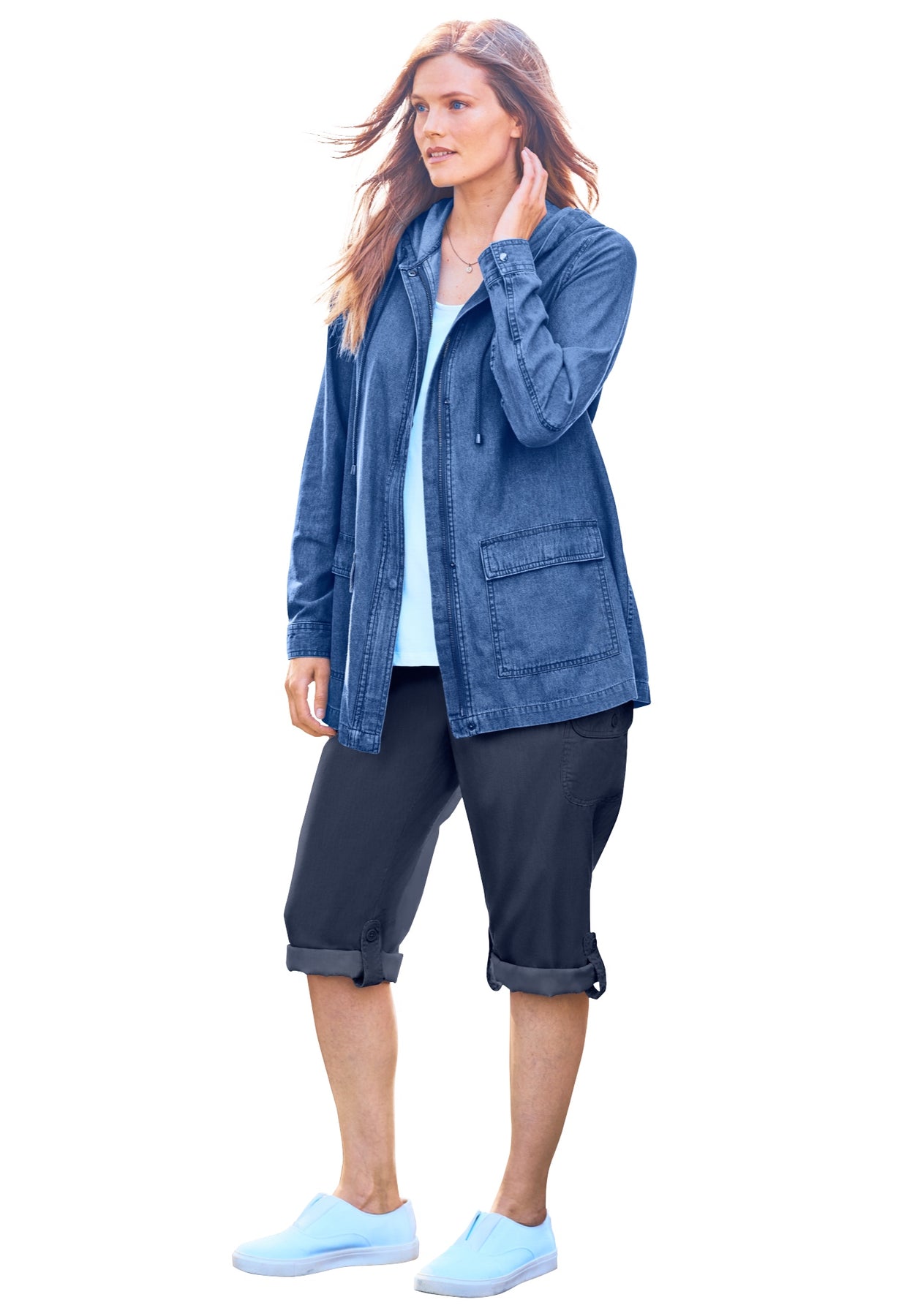 This lightweight twill jacket is a great piece to keep on hand for transitional weather when it’s not too hot or cold. A zip front with snap placket, patch flap pockets, adjustable drawstring hood and button cuffs all come together to create a causal utility feel that’s neither overdone nor bulky.