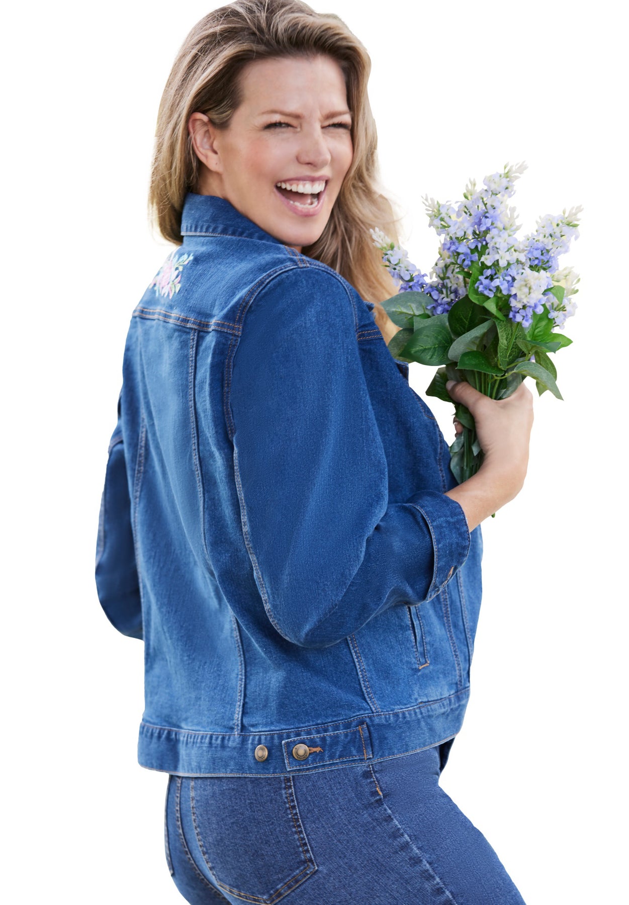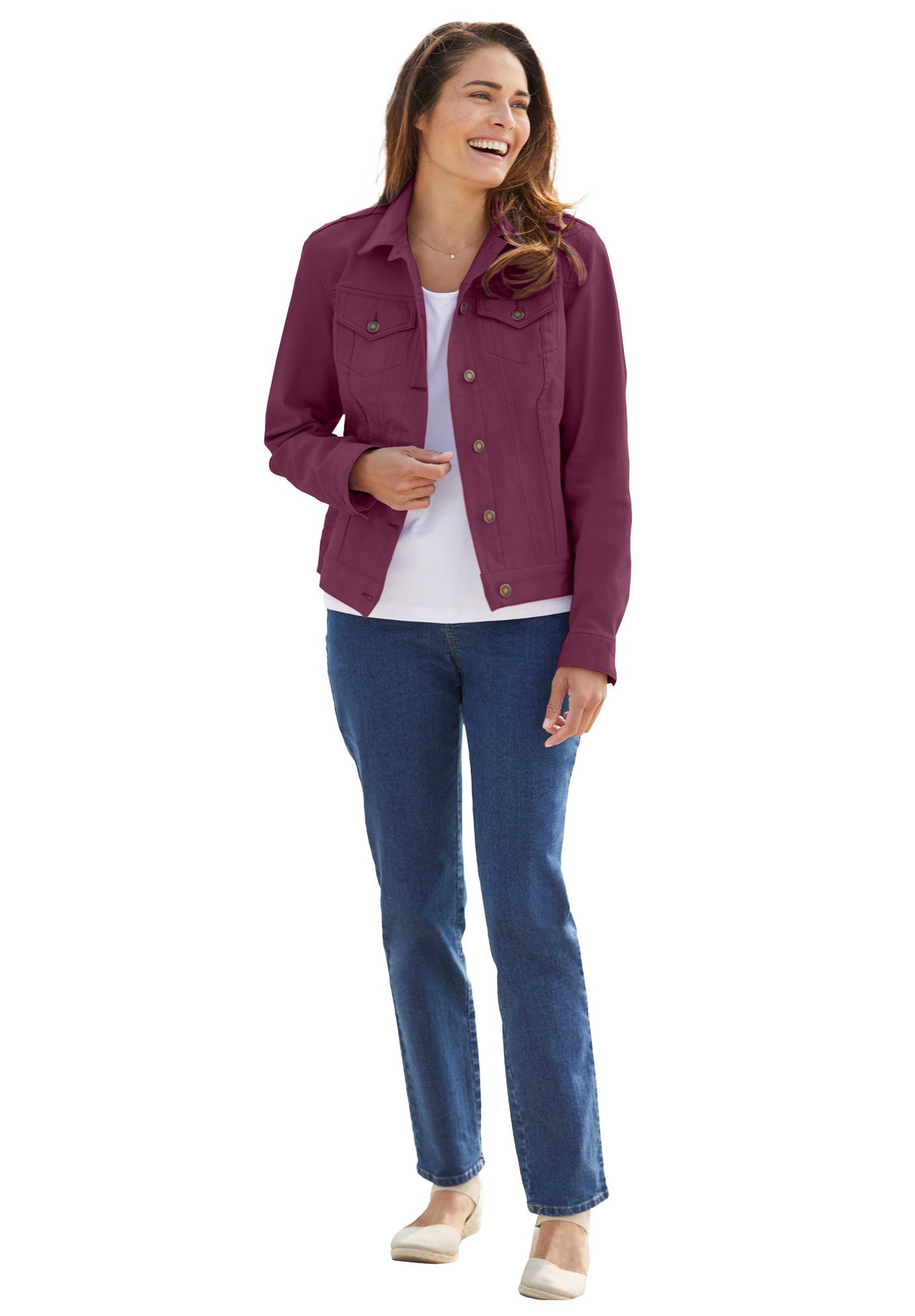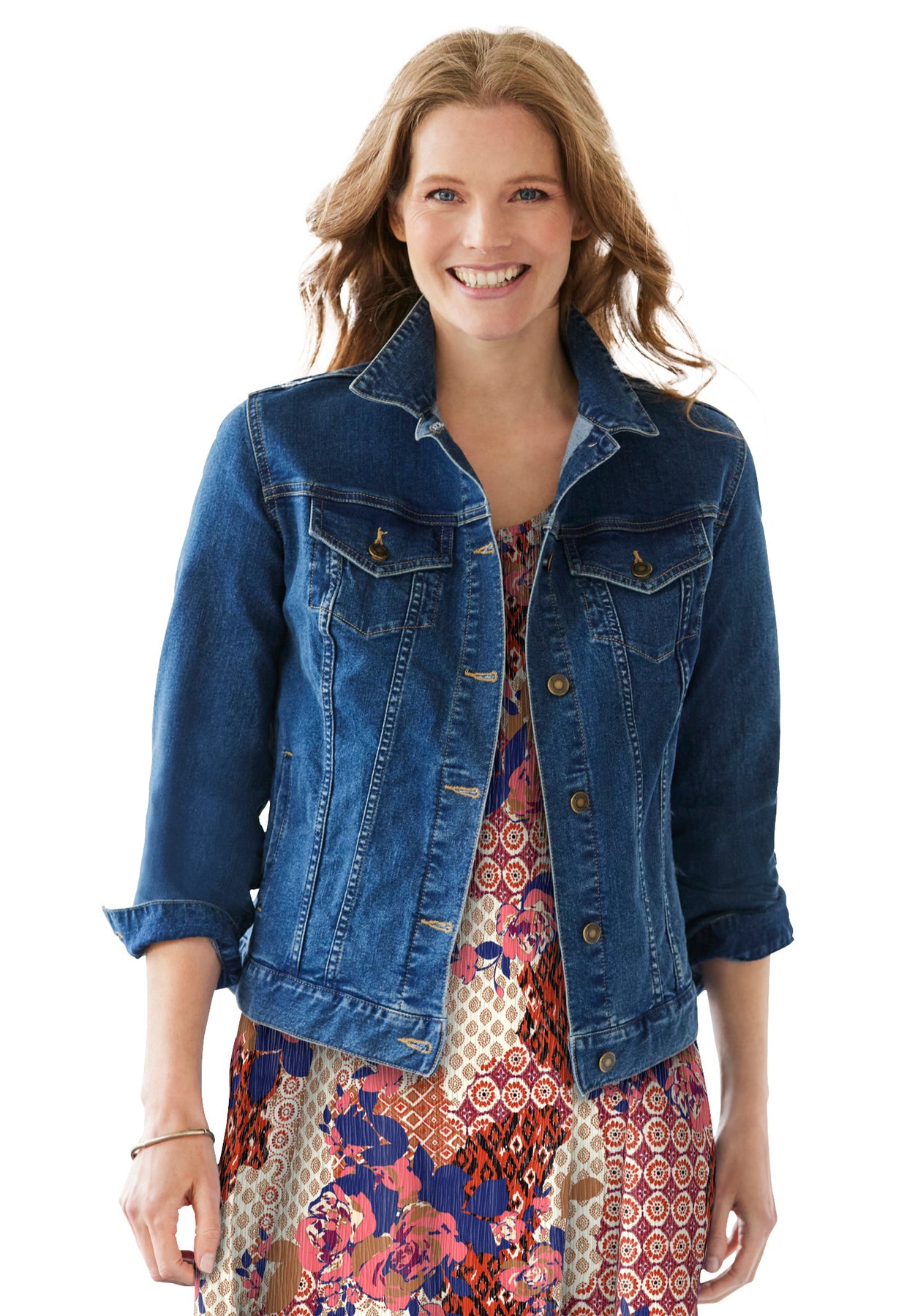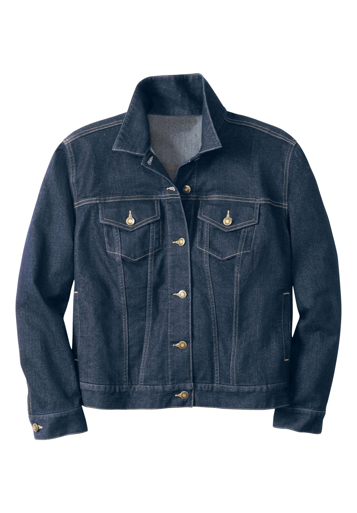 You'll love the comfortable fit of this stretch denim jacket. An absolute wardrobe classic, the felled seams, flap pockets and button front provide the denim details you know and love. A stretch fit layers perfectly over any top, and the button cuffs let you push or rolled the sleeves up for a casual feel.