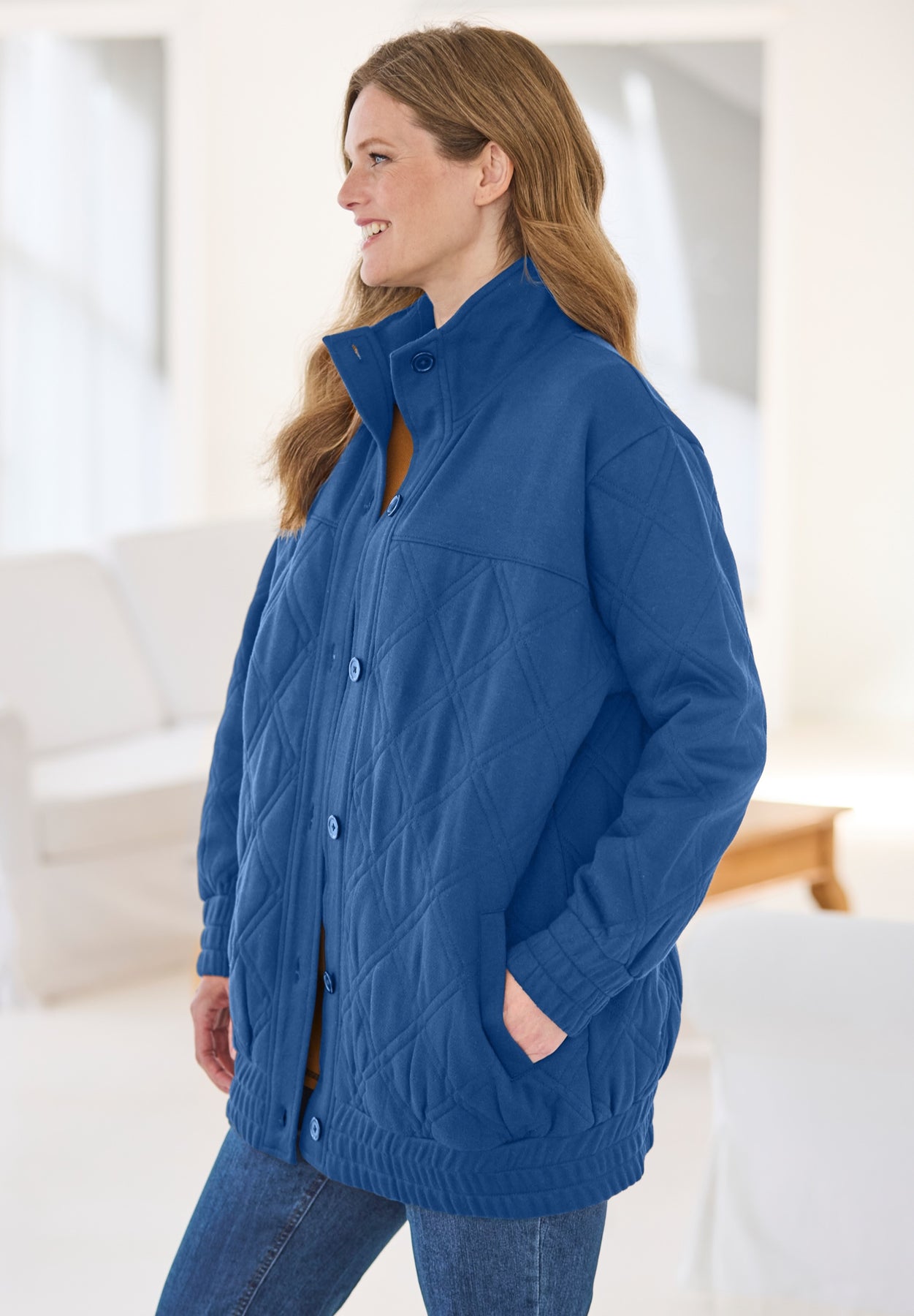 This quilted fleece jacket is your go-to layer for effortless outfitting. With its cozy texture and relaxed silhouette, it pairs seamlessly with tees, tunics, and jeans. Designed with blouson long sleeves, a banded stretch hem and cuffs, and a classic button front, it’s a must-have staple you’ll reach for again and again.