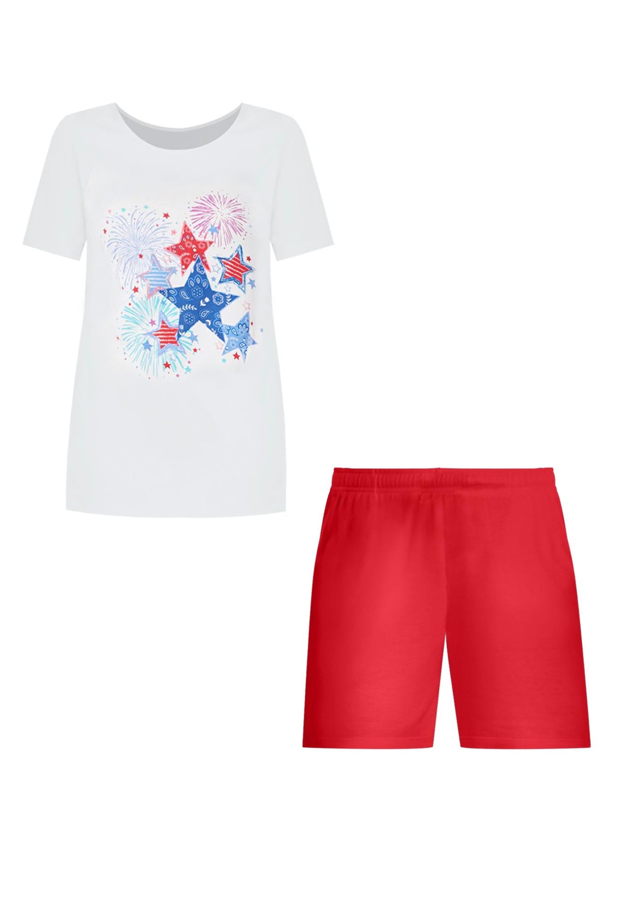 - Includes a scoop neck tee and shorts for a coordinated look.