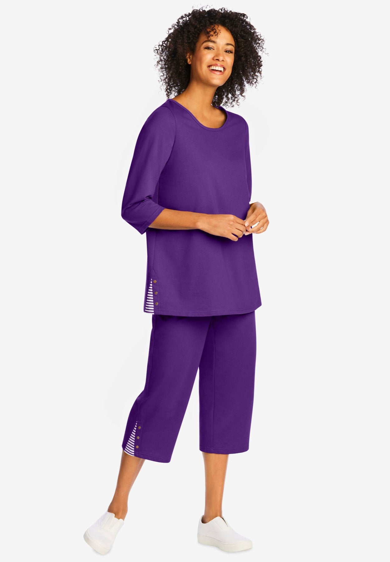 Talk about easy! This set consists of a three-quarter top and capri bottoms. The top has a flattering scoopneck and snap details. The capri has a full elastic waistband and side seam pockets.