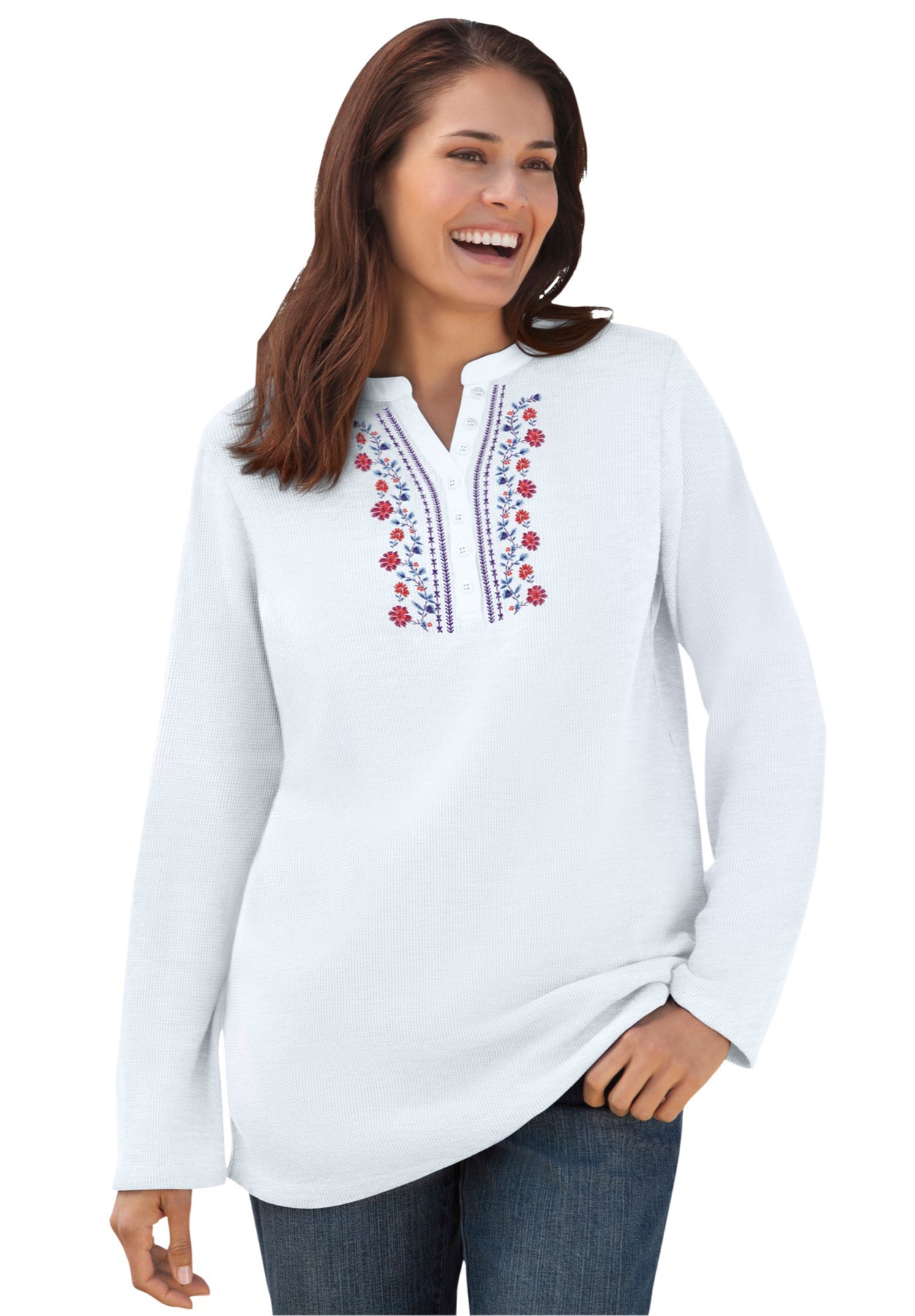 Embroidered Thermal Henley Tee | Woman Within