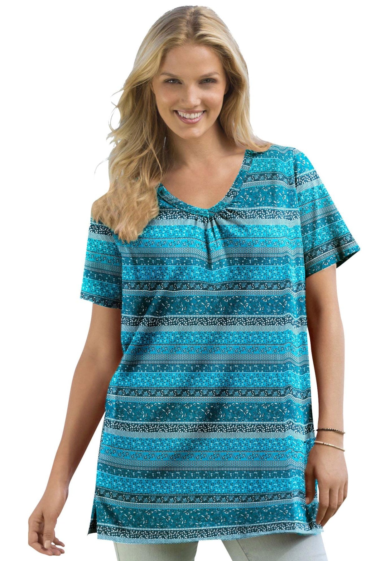 From the feminine shirred V-neck to the roomy short sleeves, you'll love everything about this soft cotton tunic. Choose from the bold, colorful prints to add a pop of color to your look.