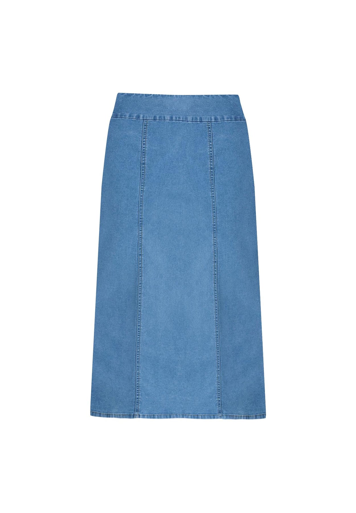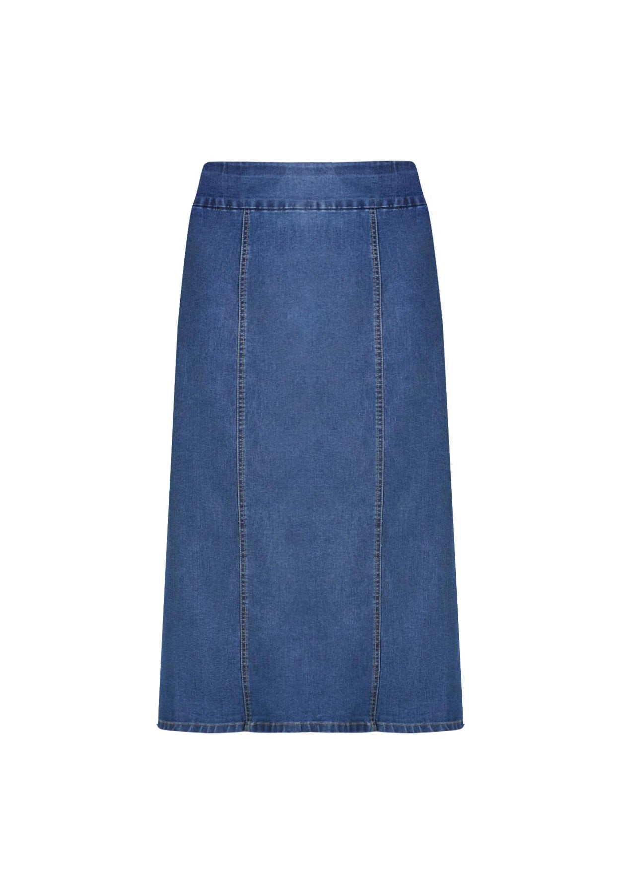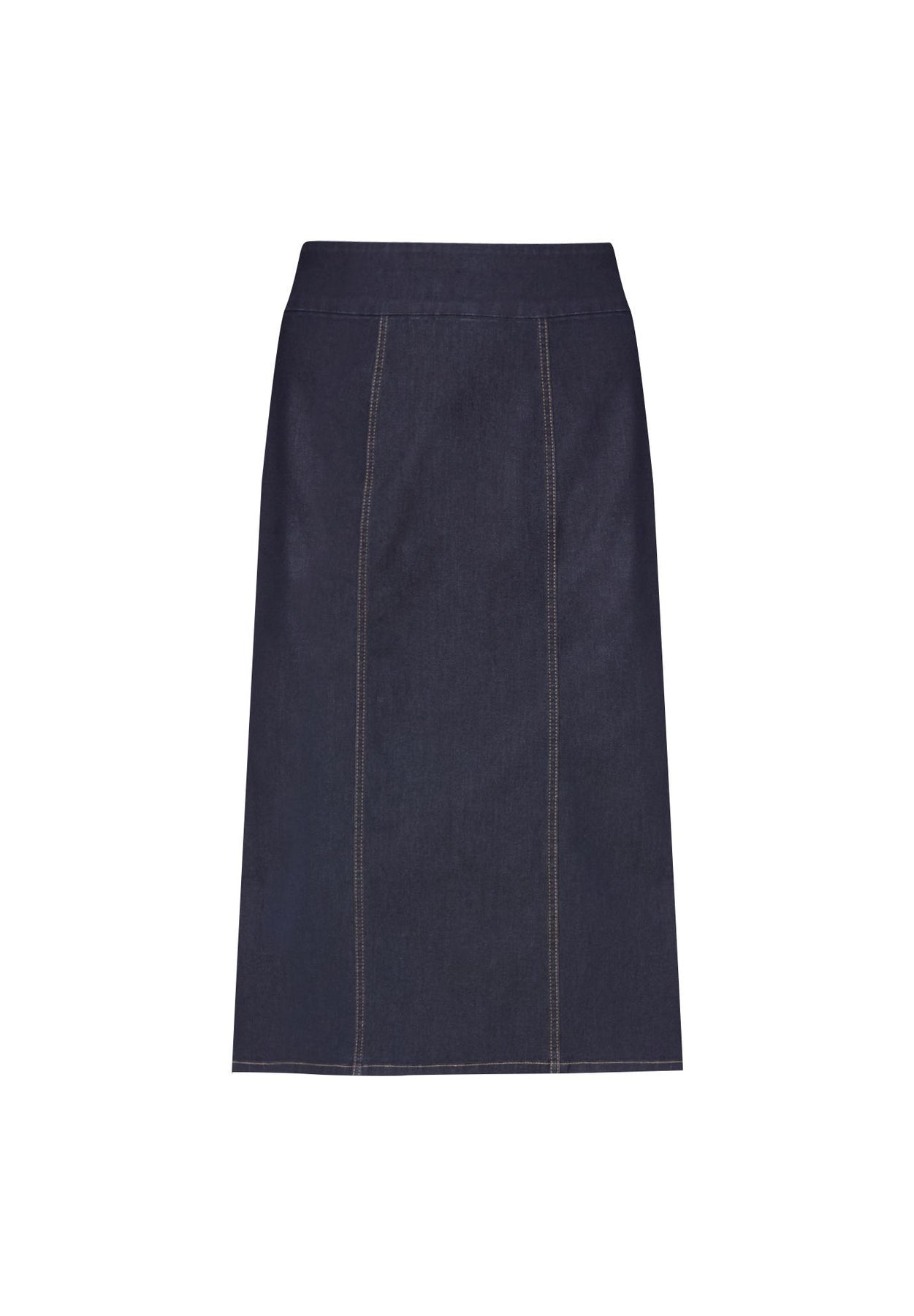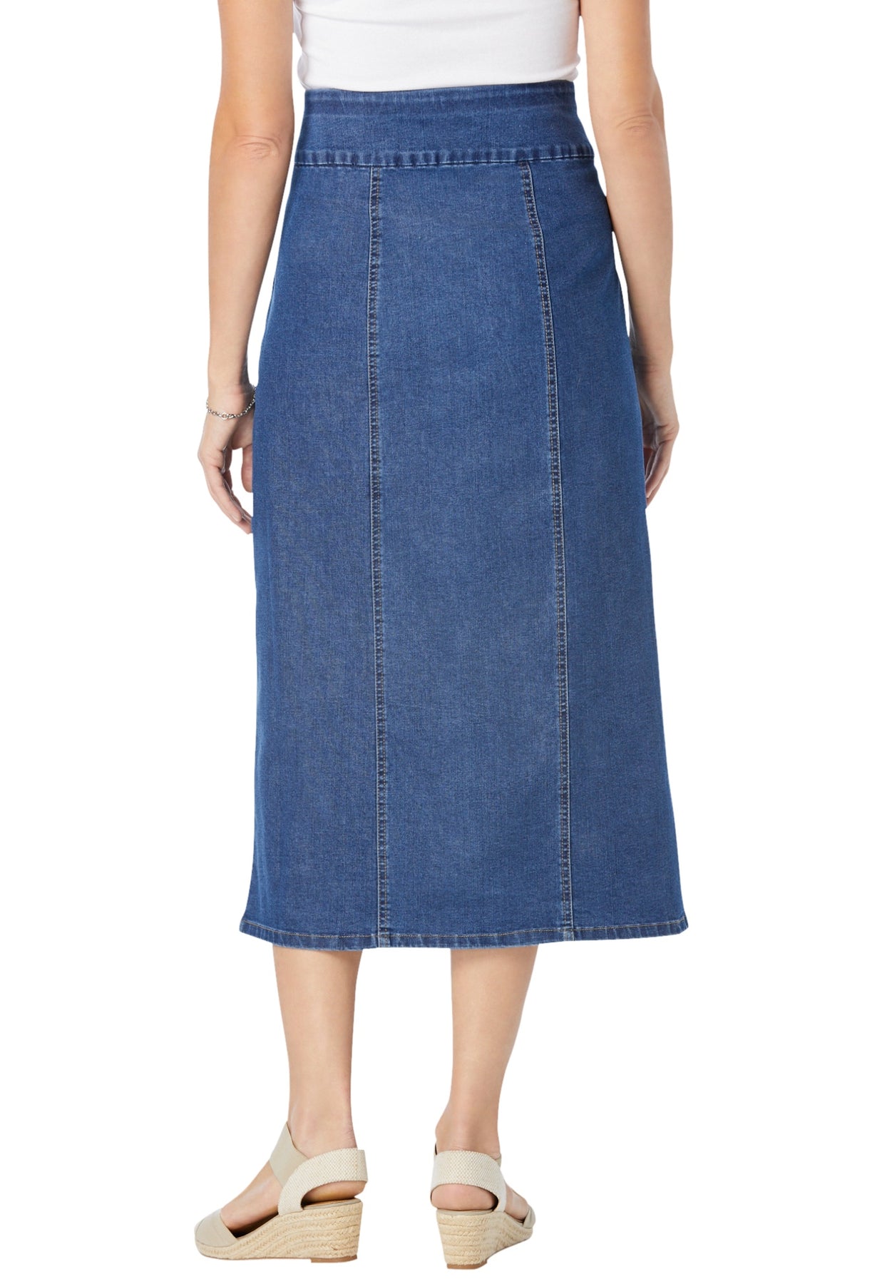 This easy, A-line denim jeans skirt is designed with a full, flat, covered elastic, no-gap waistband that lies flat against the body to provide a smooth look under all your favorite tops and tunics. Enjoy the classic look of a great pair of jeans but move comfortably thanks to allover stretch.