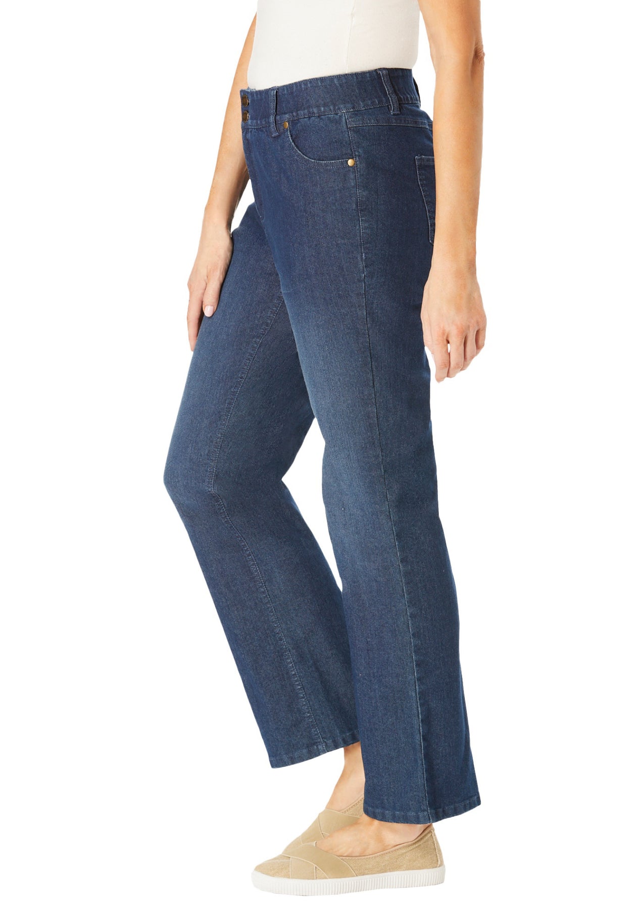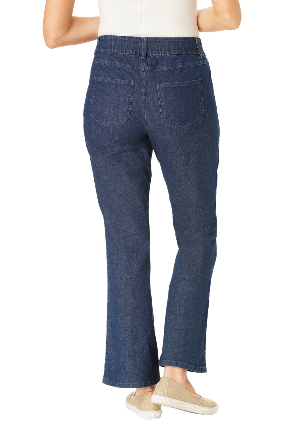 The perfect stretch fit jeans, with secret shaping panels that slim your tummy. These classic five-pocket jeans also have a slimming inner elastic waistband for all-around comfort. Made with a bootcut for a stylish fit and feel, they look great and feel even better with the power of stretch. Easy on/off zip fly with jean tack button closure.