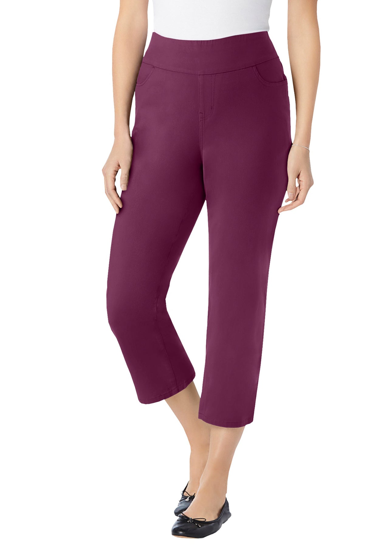 This easy, denim capri is designed with a full flat-elastic. A no-gap waistband that lays flat against the body to provide a smooth look under all your favorite tops and tunics. Enjoy the classic look of a great pair of jeans but move comfortably thanks to allover stretch.