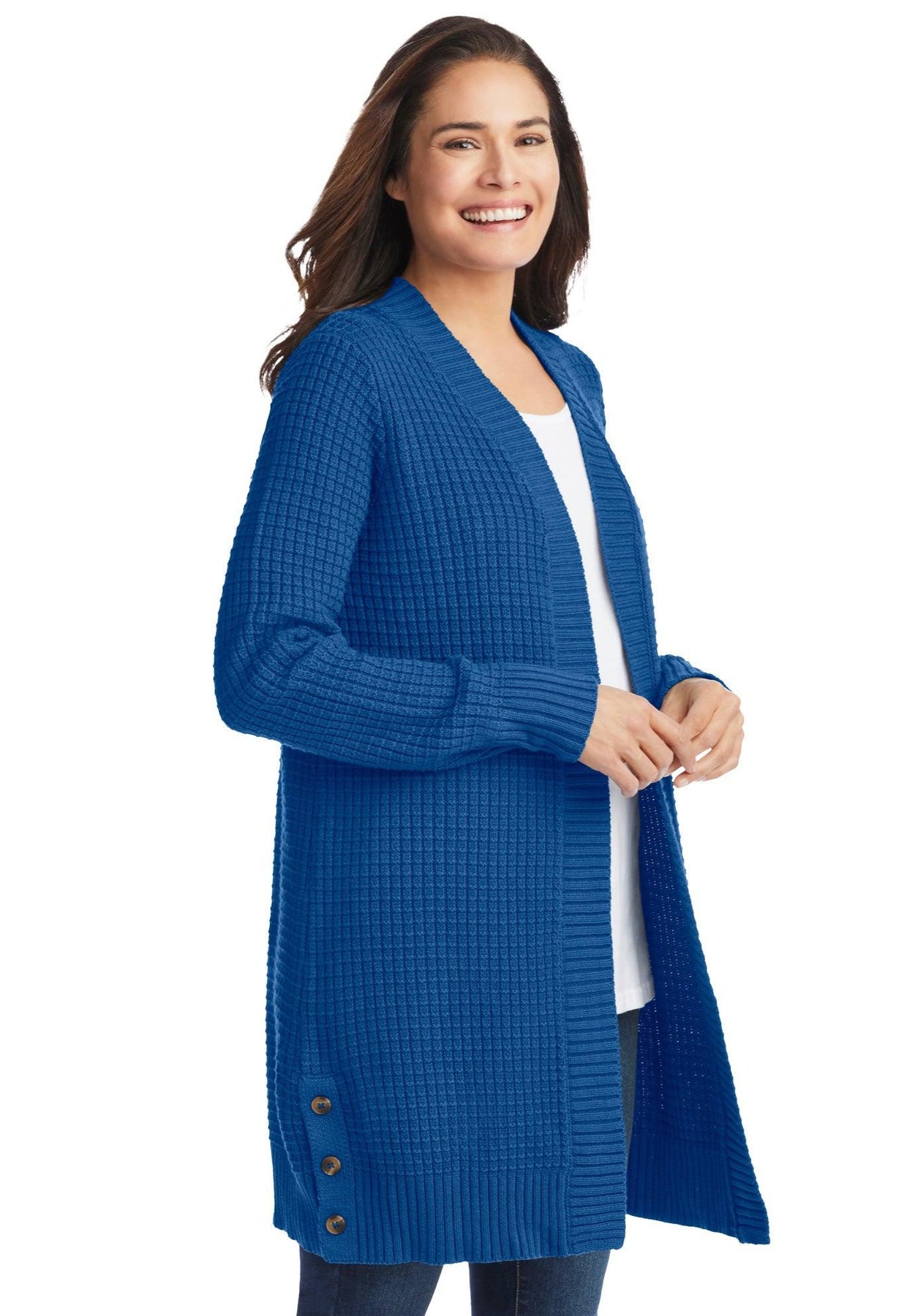 Button accents dress up this cozy cardigan that looks great over pretty much everything. It has a relaxed fit and longer-length for extra coverage.