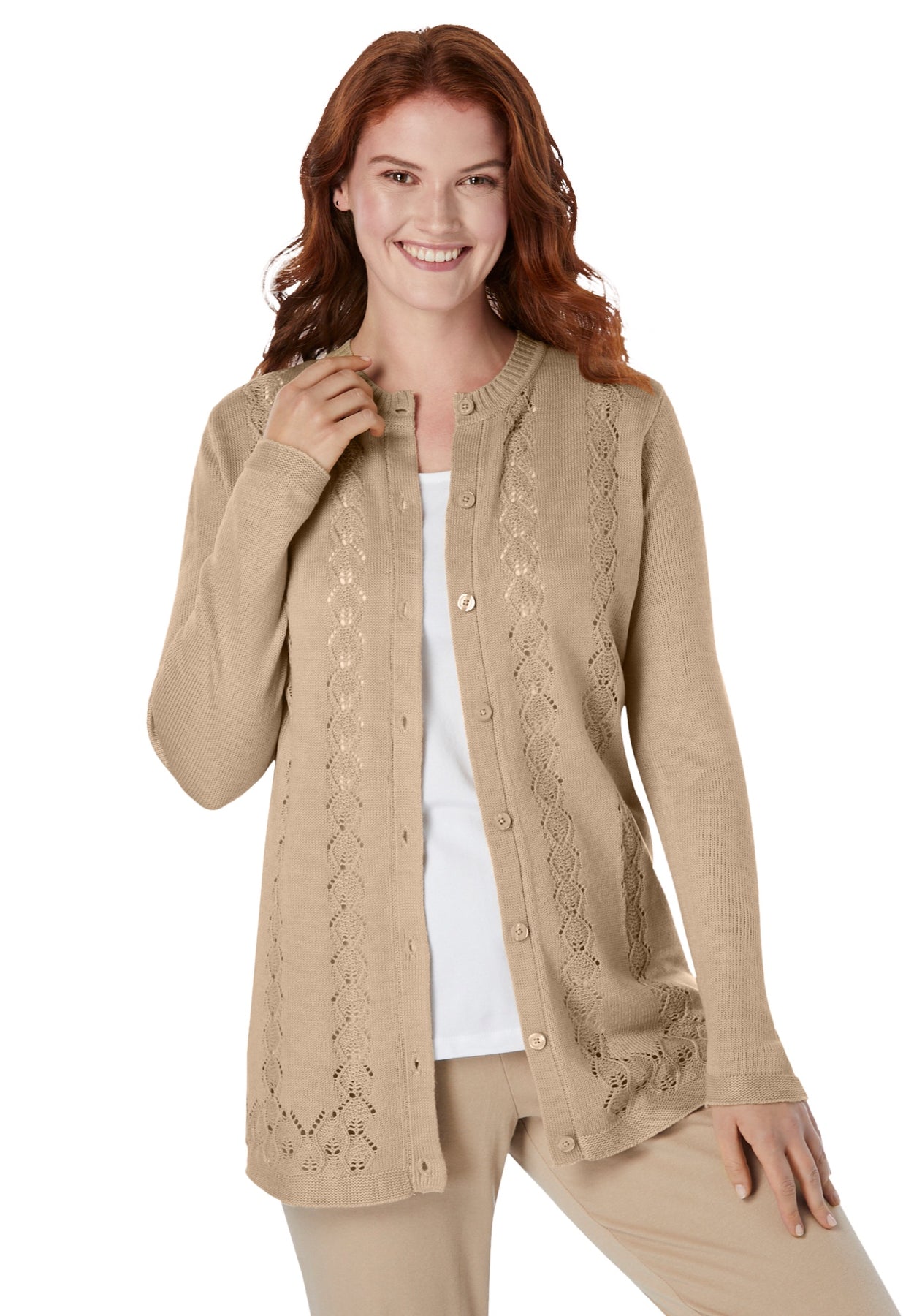 This airy knit cardigan has pretty open pointelle details that add a delicate and feminine touch to a classic style. A button front can be worn open or closed, creating a lovely layer that shows a peek of your shirt. Solid knit back.