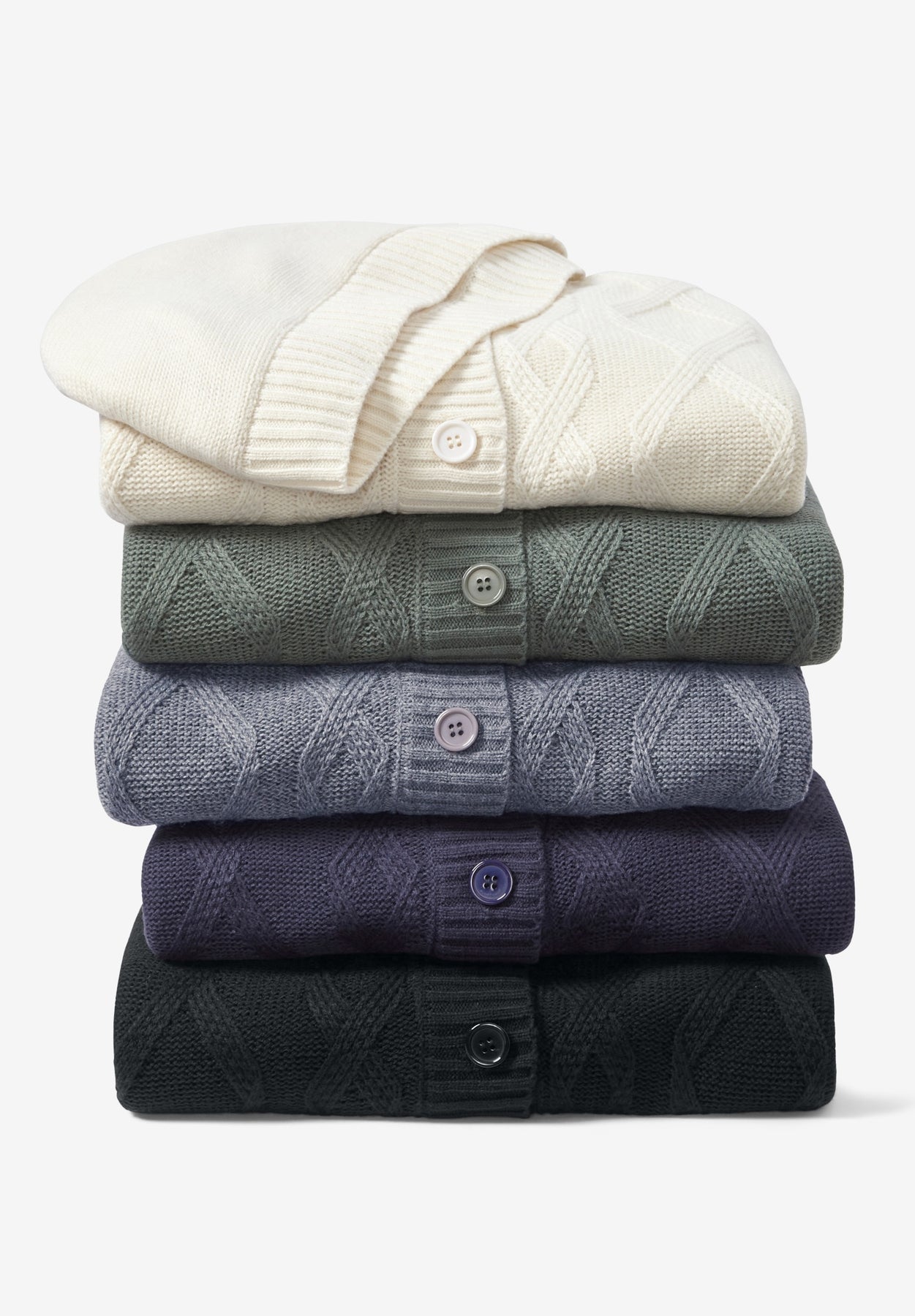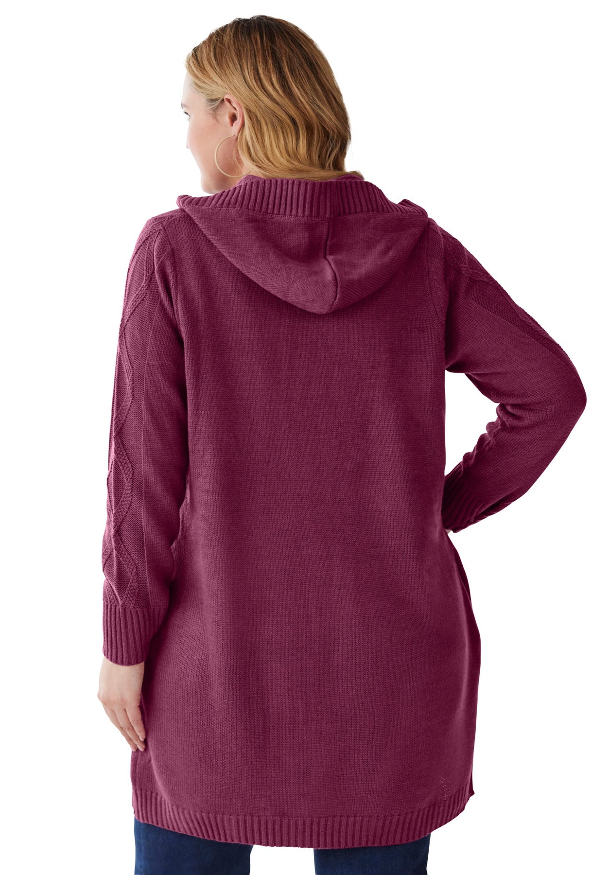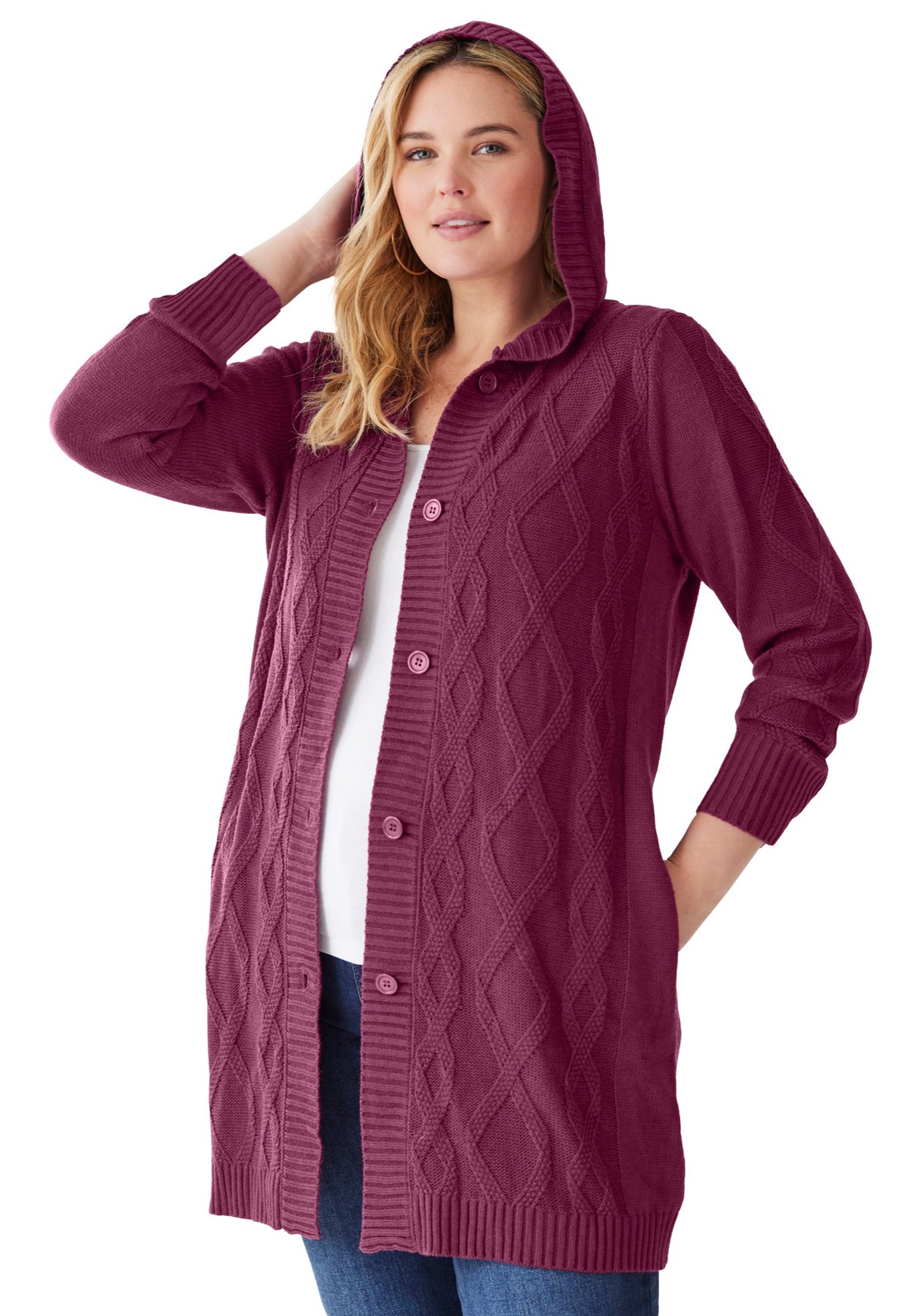 Bold colors and a rich cable texture make this cable cardigan a welcome addition to your wardrobe. The attached hood makes it a wonderful choice with a simple tee.