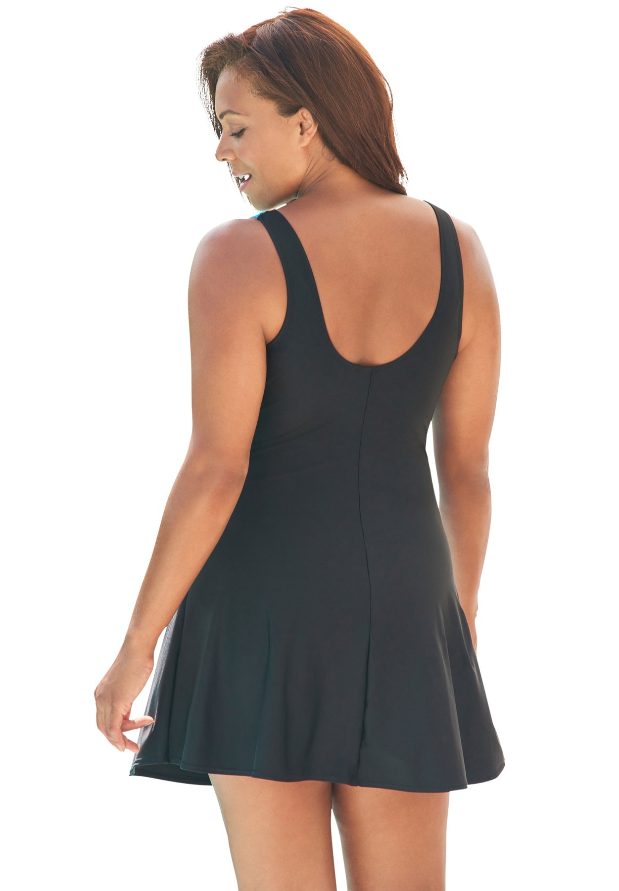 Embrace your figure with the stylish Fit-and-Flare Swim Dress featuring a waist-cinching color-blocked design. V-neck front and scoop neck back. Built-in shelf-bra and molded cups. Fully lined power-mesh lining for tummy control.
