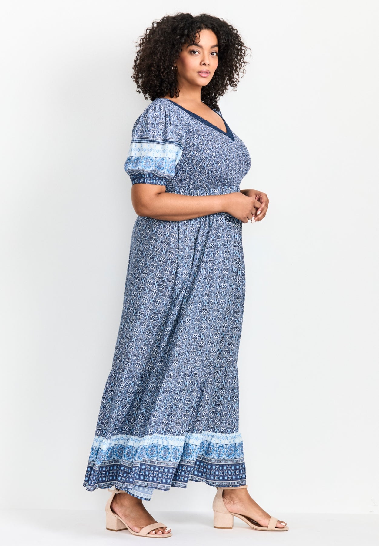 Chase the sun in our oh-so curve-loving Eve Border Dress, combining a breezy fabrication with pretty print to catch eyes from across the street. Whether you're headed to lunch or a casual city stroll, this dress can do it all.