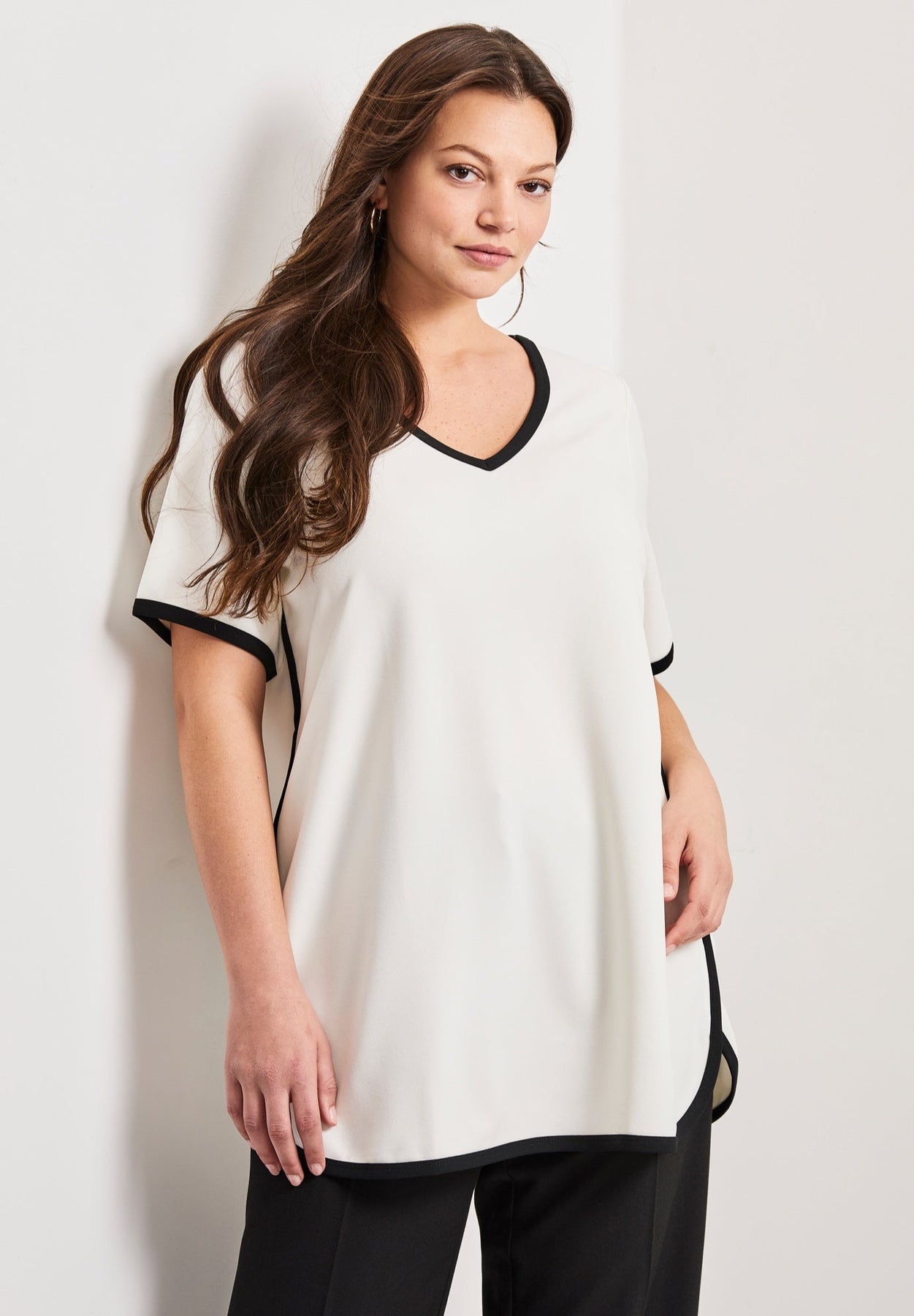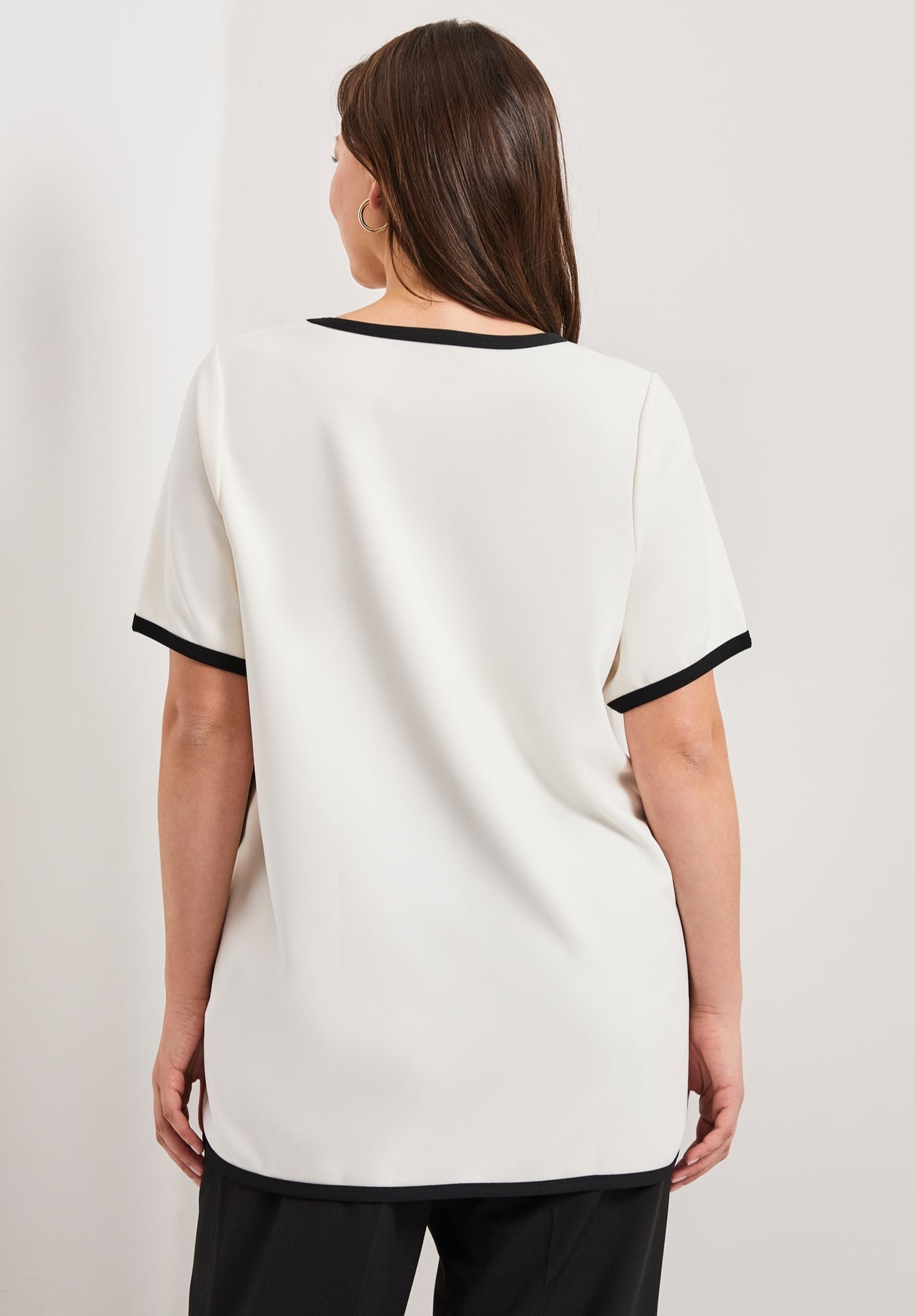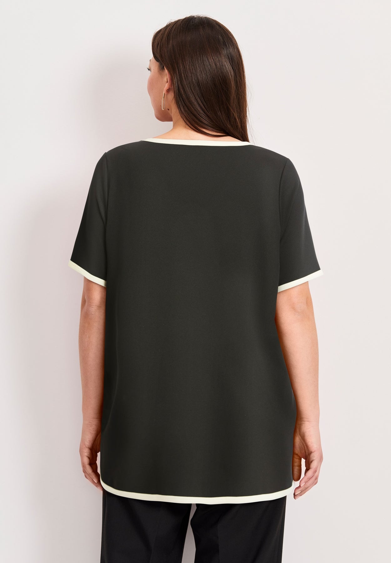 This top features a relaxed fit with black contrast trim along the neckline, sleeves, and hem for a polished finish. The V-neckline and short sleeves add to its classic yet comfortable design. With its rounded hemline and lightweight fabric, this top is perfect for pairing with trousers or jeans for a versatile, everyday look.