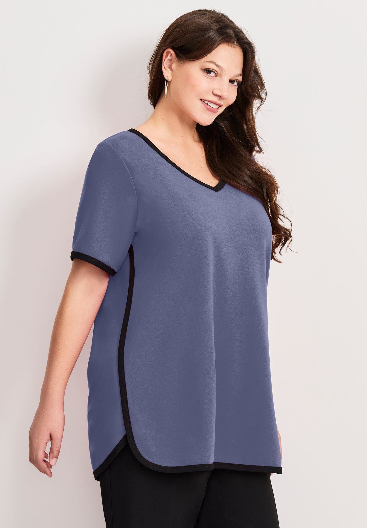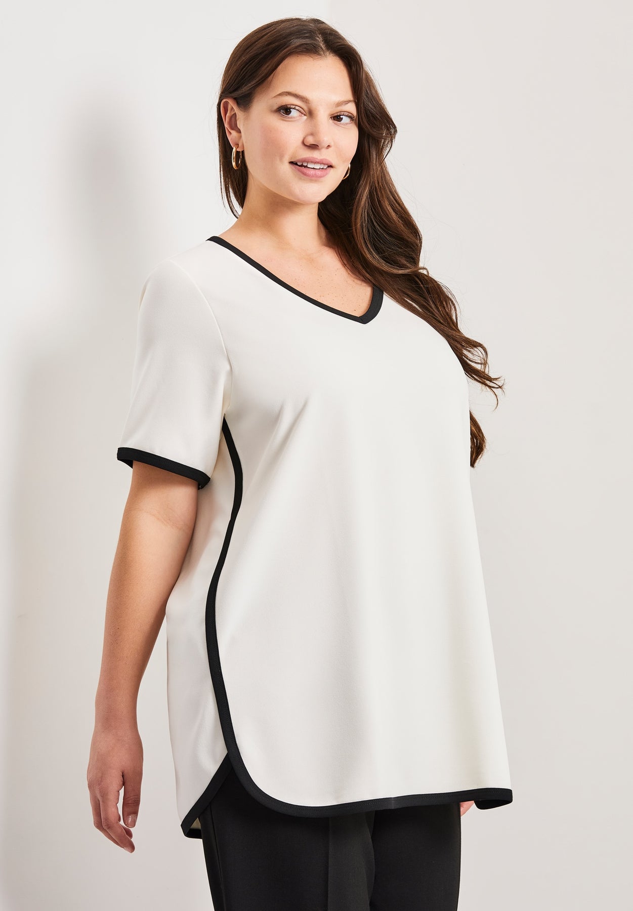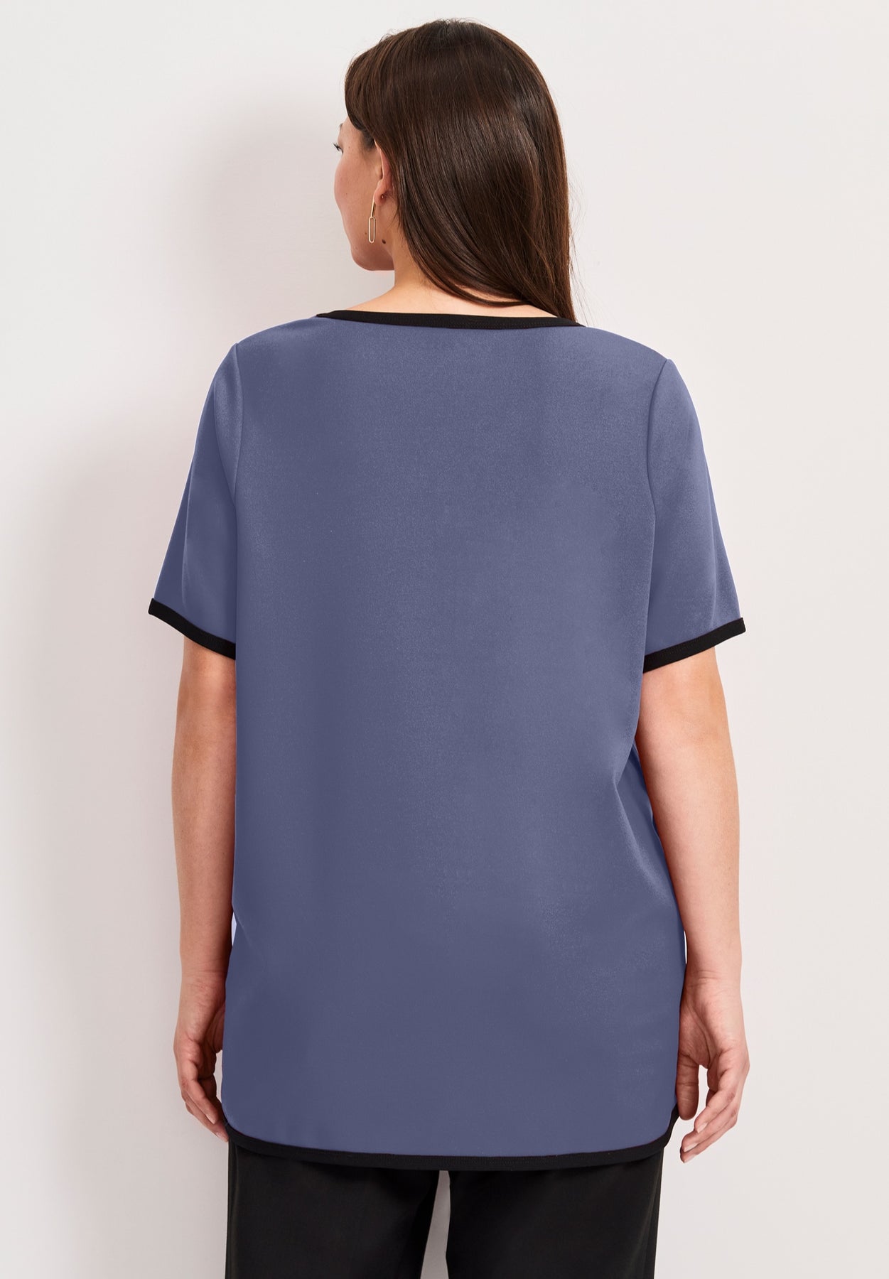 This top features a relaxed fit with black contrast trim along the neckline, sleeves, and hem for a polished finish. The V-neckline and short sleeves add to its classic yet comfortable design. With its rounded hemline and lightweight fabric, this top is perfect for pairing with trousers or jeans for a versatile, everyday look.