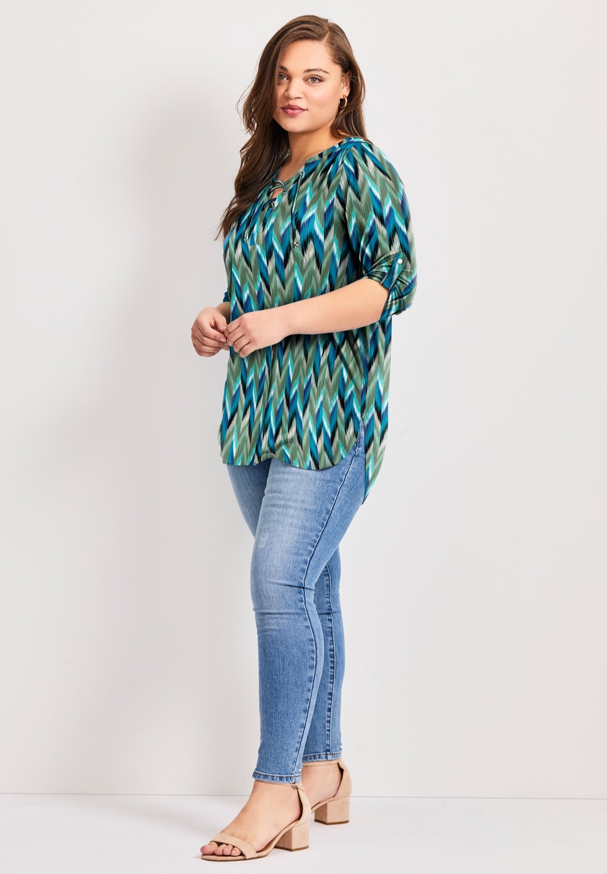 This top features a lace-up neckline with metallic accents for added detail. Its high-low hem and 3/4 length sleeves with button-tab make it both flattering and comfortable, ideal for pairing with jeans or casual trousers for an effortless, chic look.