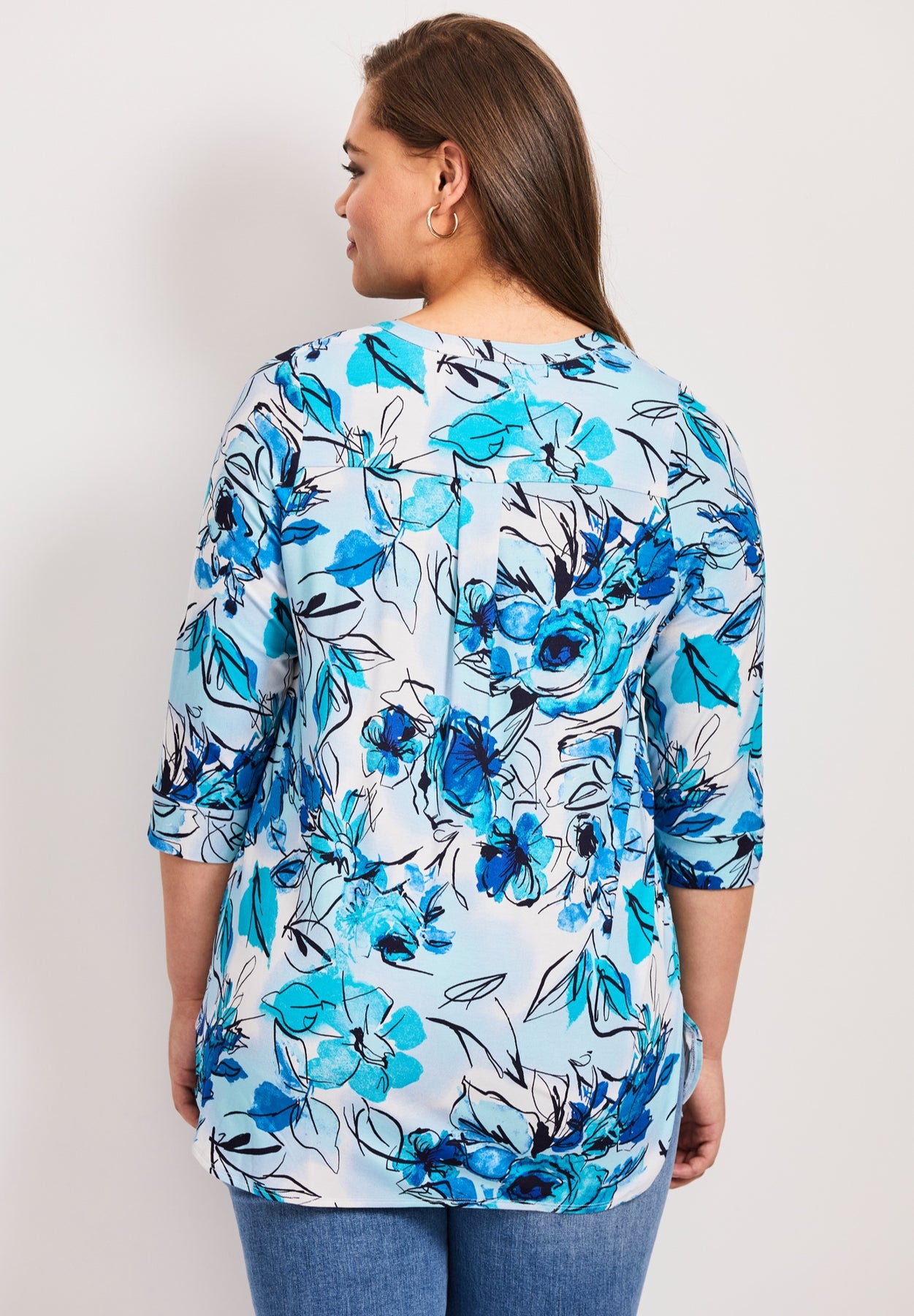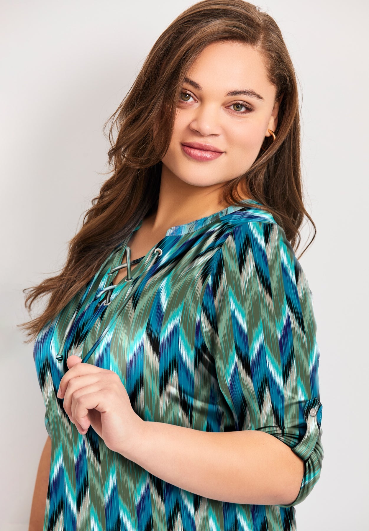 FIT: Relaxed fit. Lace up neckline. 3/4 length sleeves with button tab.