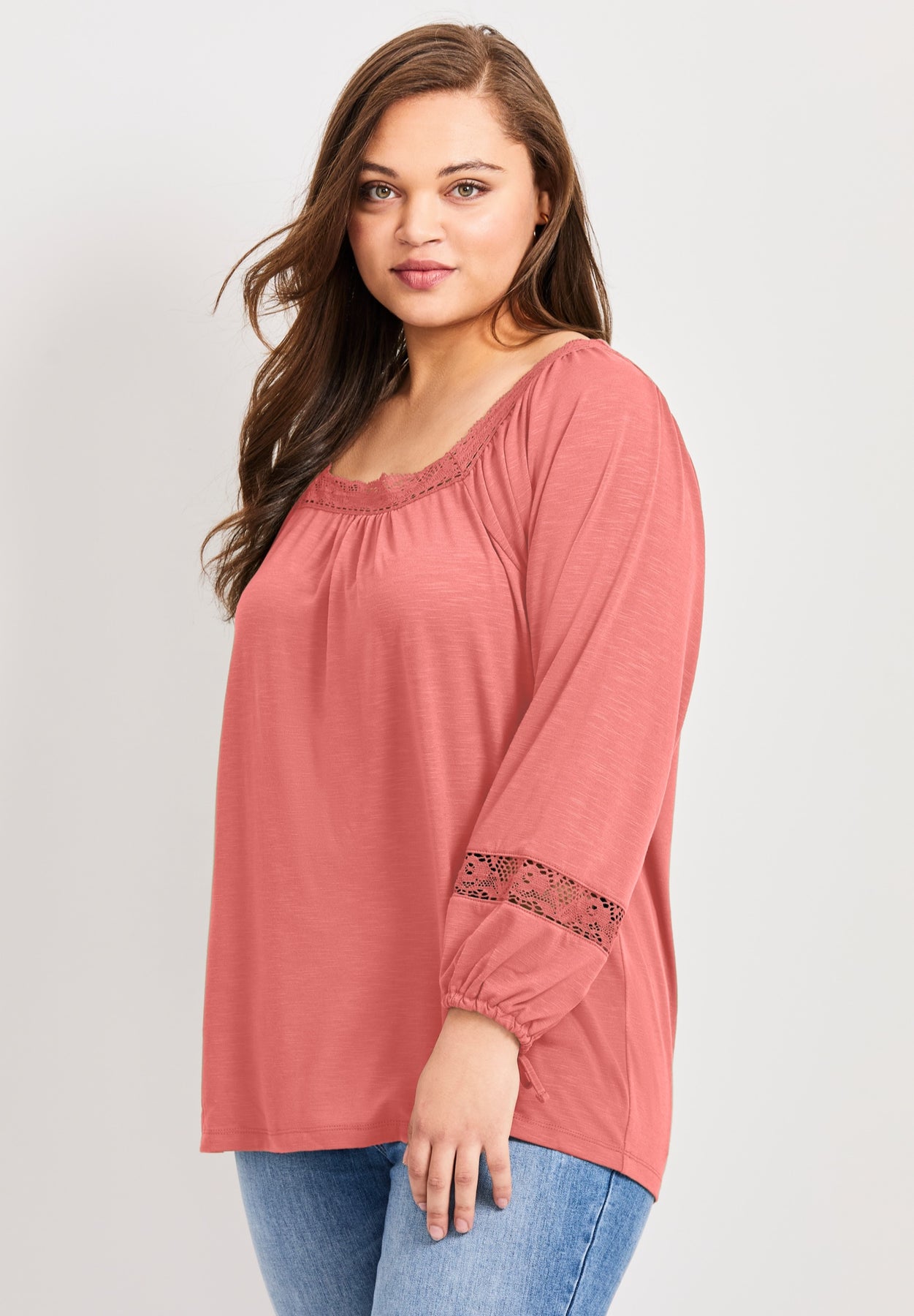 This top features a feminine square neckline with delicate lace trim, adding a touch of charm to its relaxed silhouette. The long blouson sleeve with tie create a soft, boho-inspired look perfect for effortless everyday styling.