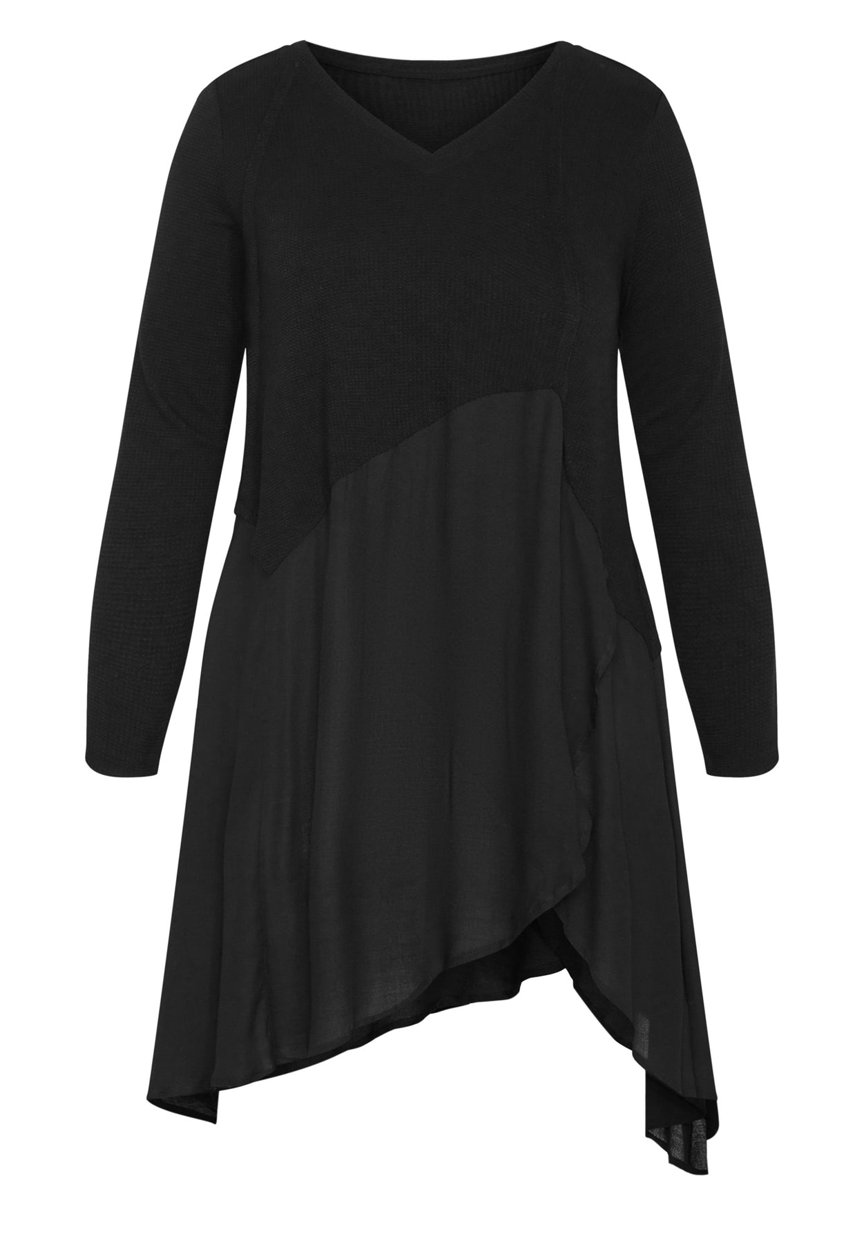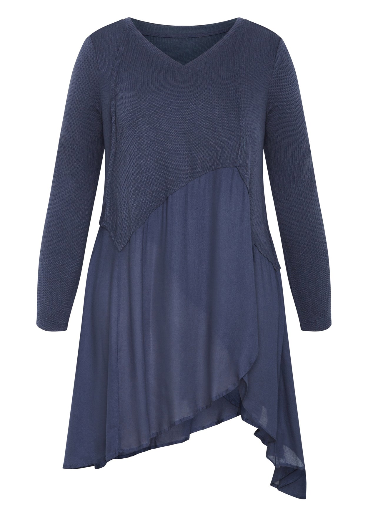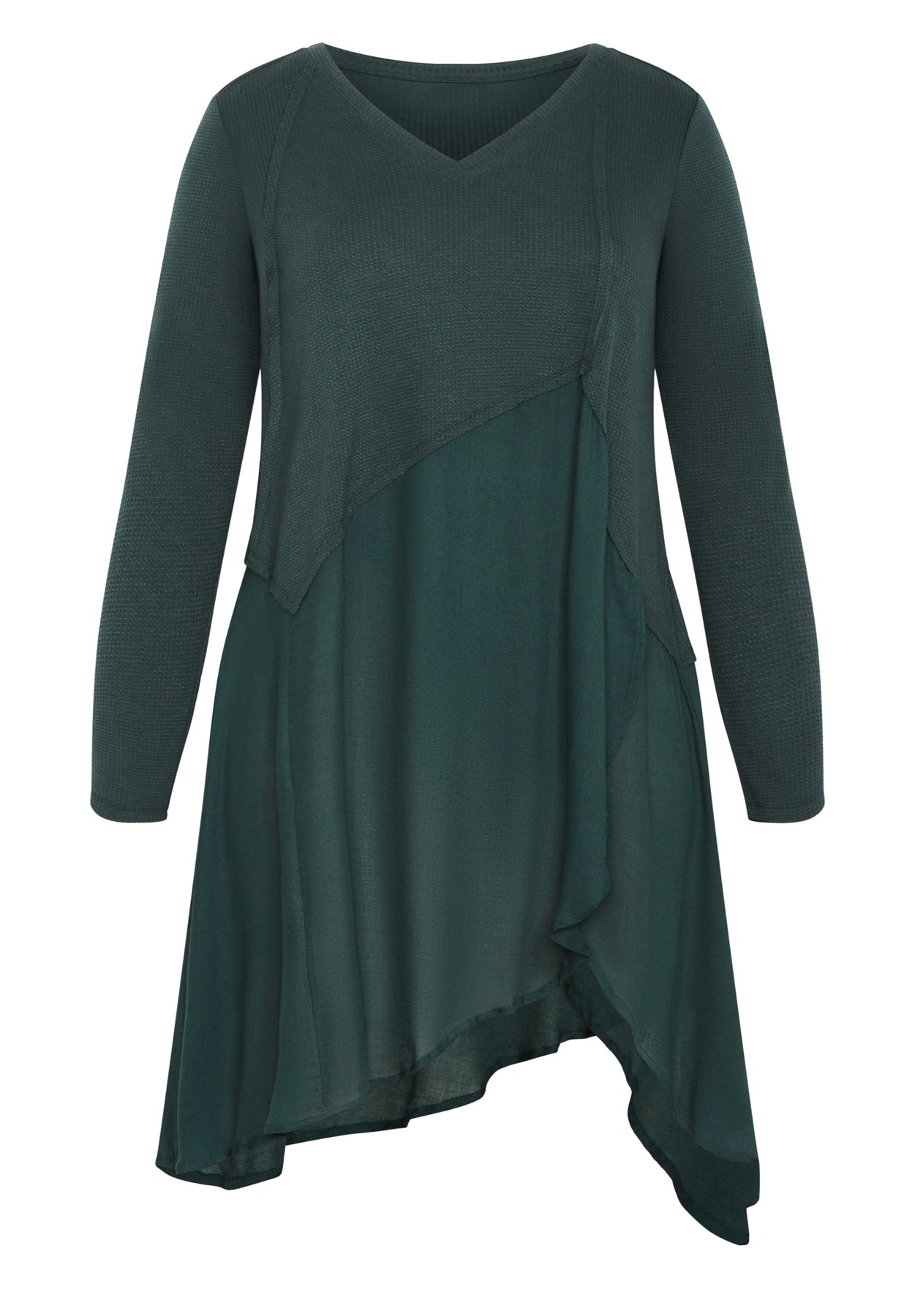 Exuding feminine flair with an asymmetrical ruffle hem, slip into the Waffle Panel Top and love your curves! Featuring long sleeves and a V-neckline, this top is a sure magnet for attention.