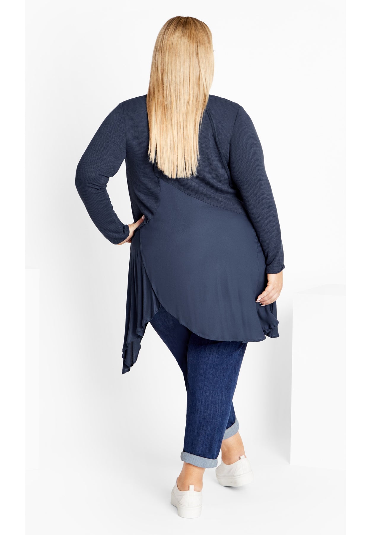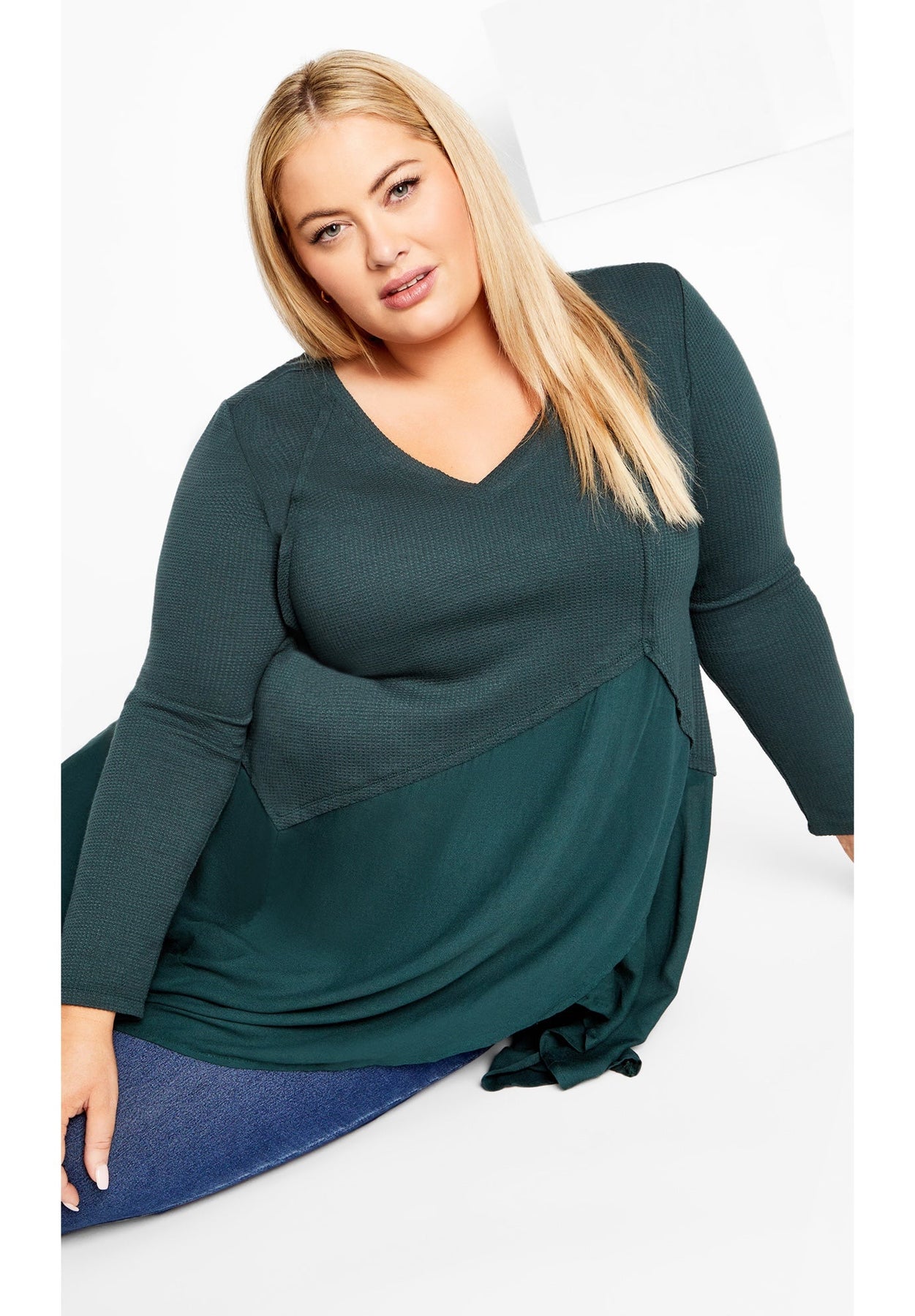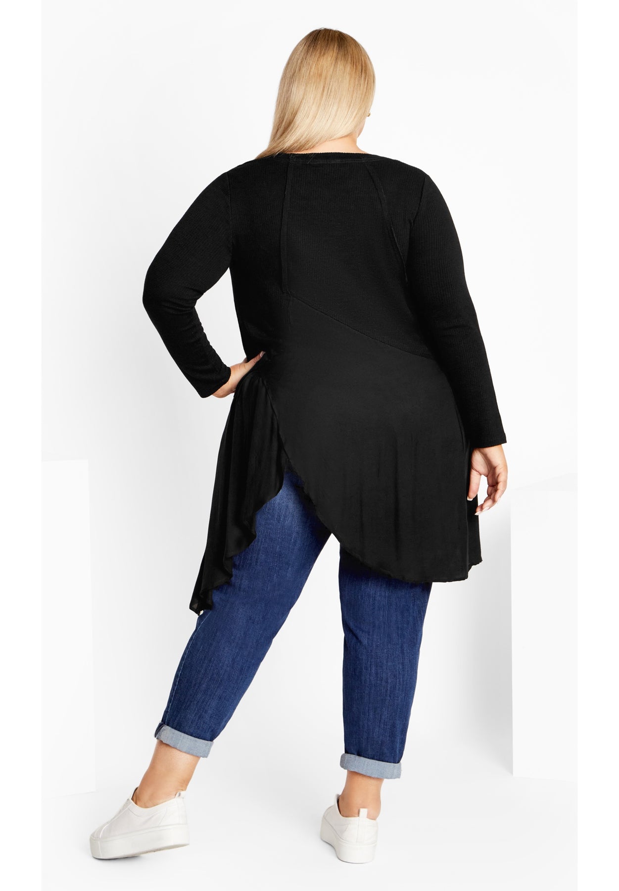 Exuding feminine flair with an asymmetrical ruffle hem, slip into the Waffle Panel Top and love your curves! Featuring long sleeves and a V-neckline, this top is a sure magnet for attention.