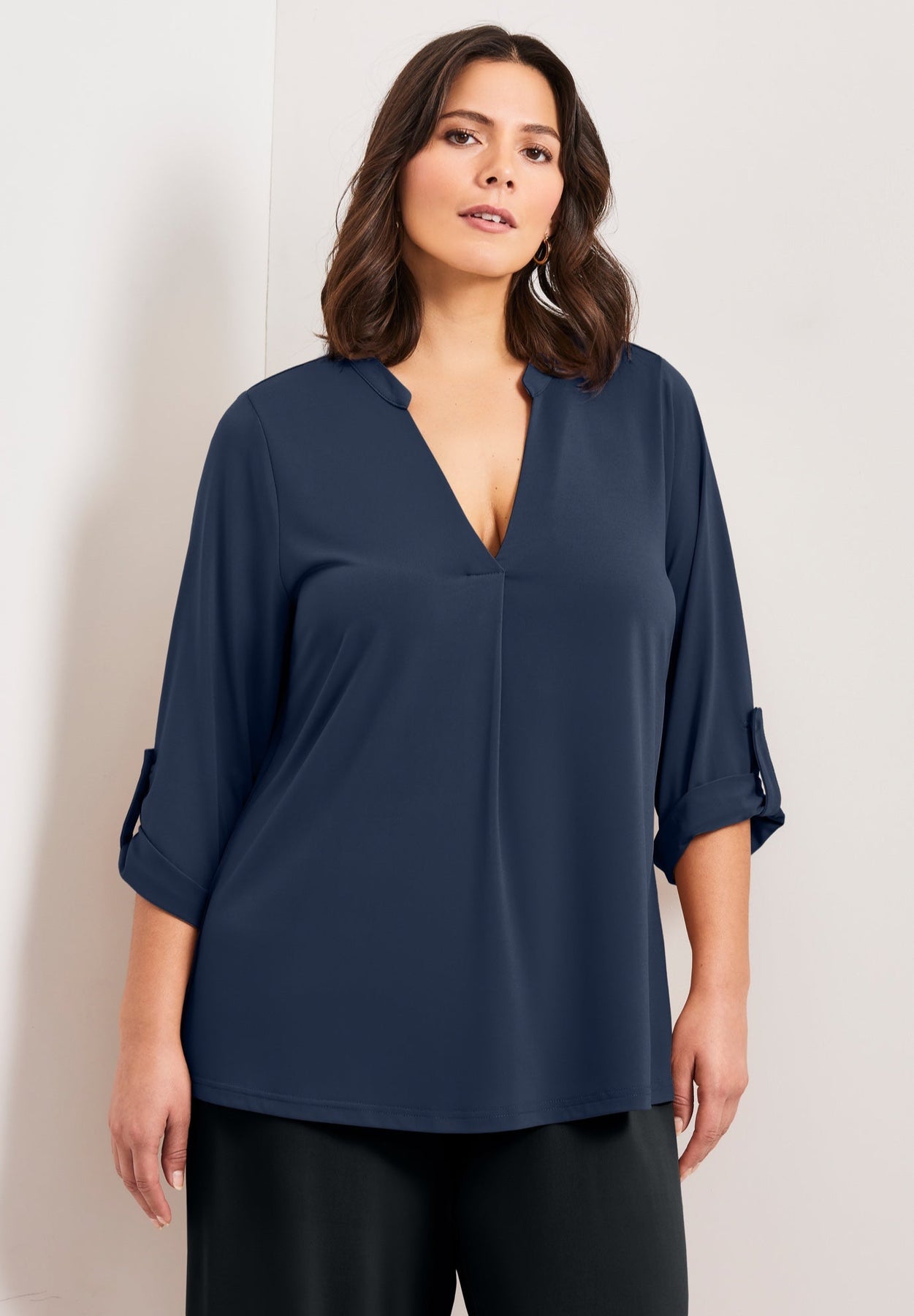 Transform your look from desk to dinner with the Audrey Top! This trendy piece features a flattering V neckline and is made from stretch Jersey ITY fabric for a comfortable yet chic fit. You'll adore the playful 3/4 sleeves with tab and button detail—perfect for adding a touch of style to your outfits. Whether you're headed to a meeting or a night out, the Audrey Top is your fashion-forward companion.