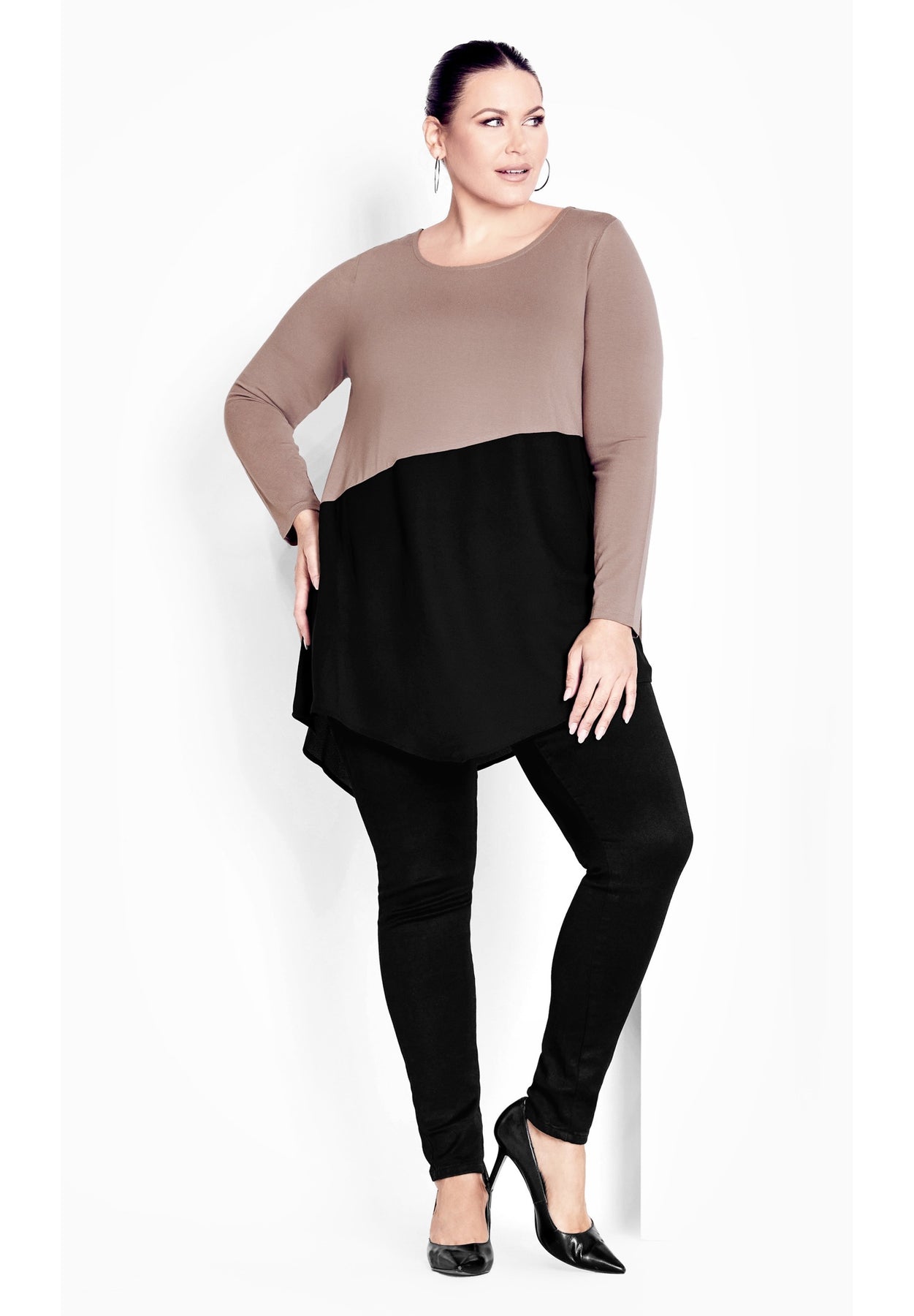 - Hip length curved hemline