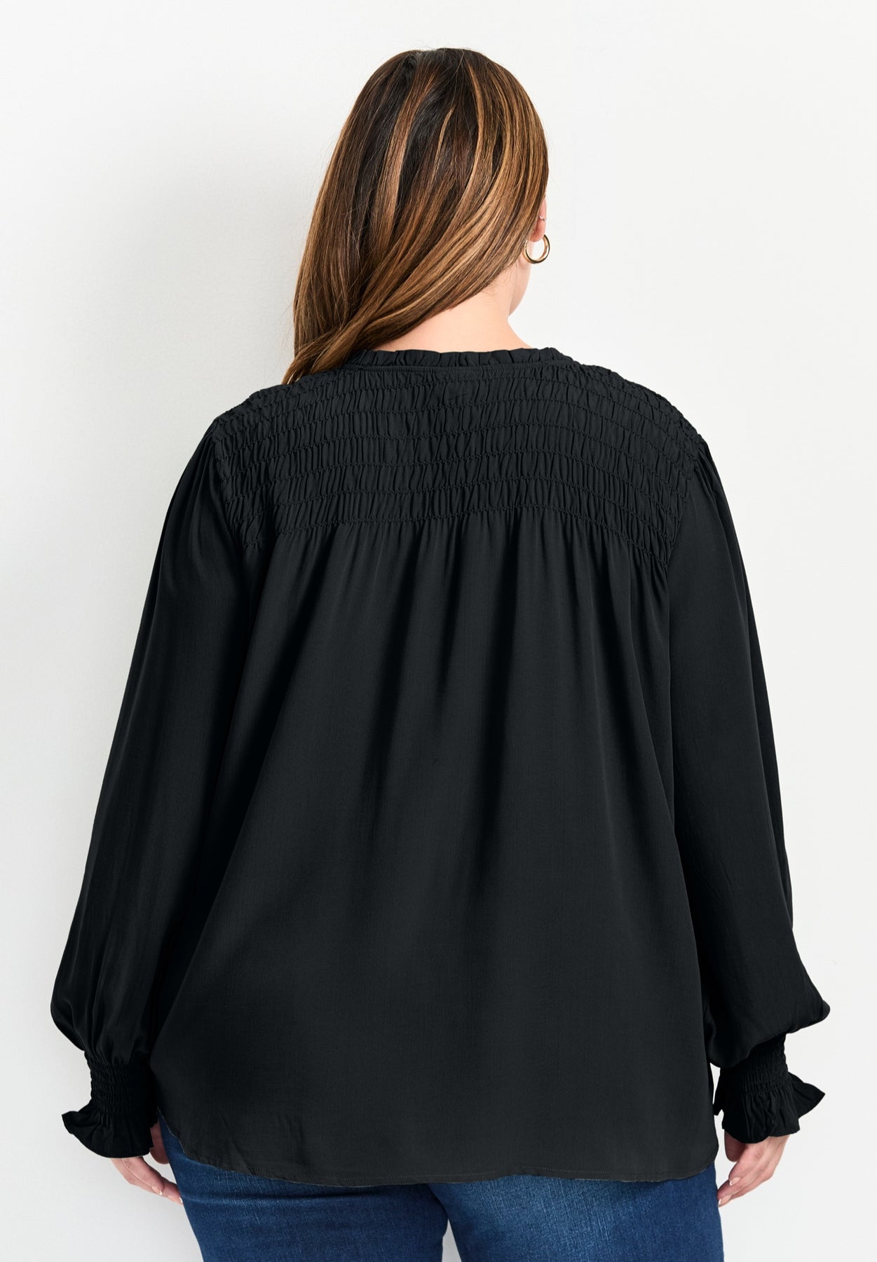 - Long blouson sleeves with shirring detail