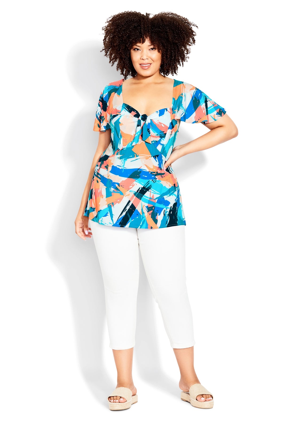 A playful style that's easy to love, the Kata Print Top brings a pop of colour to your collection. The short ruffle cap sleeves keep things cool and comfortable while the self-tie bust detail brings some youth to the look for a stylish finish.Key Features Include:- V-neckline- Self-tie bust detail- Short ruffle cap sleeves- Pull-over fit- Bust darts for shape- Fitted silhouette- Curved hemlinePair with slacks and a simple gold necklace for an easy weekend look.